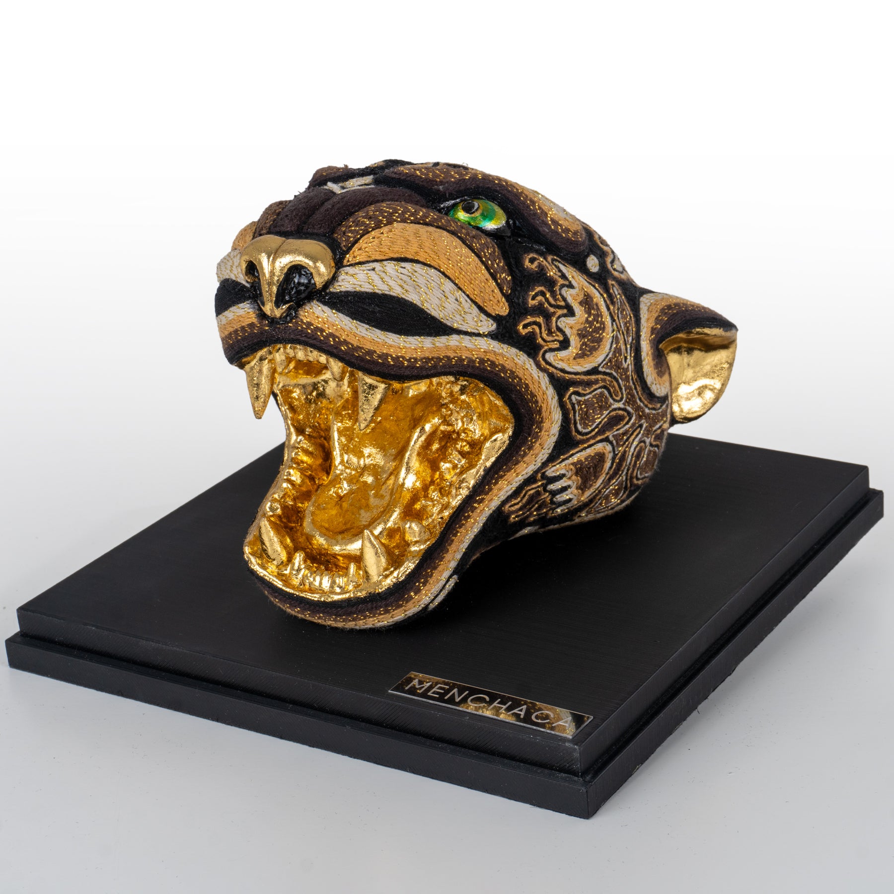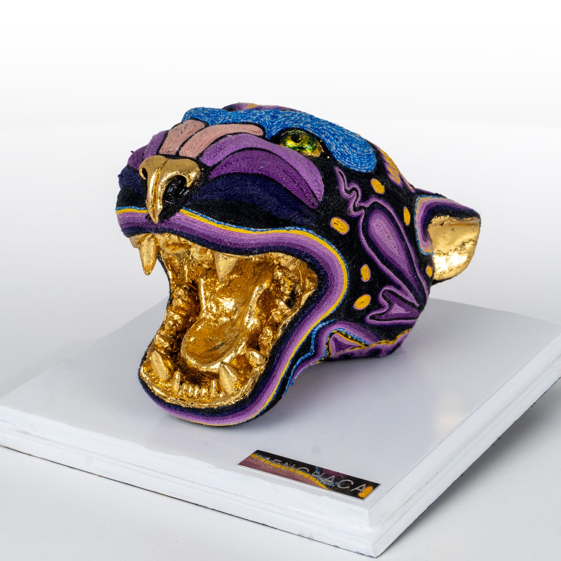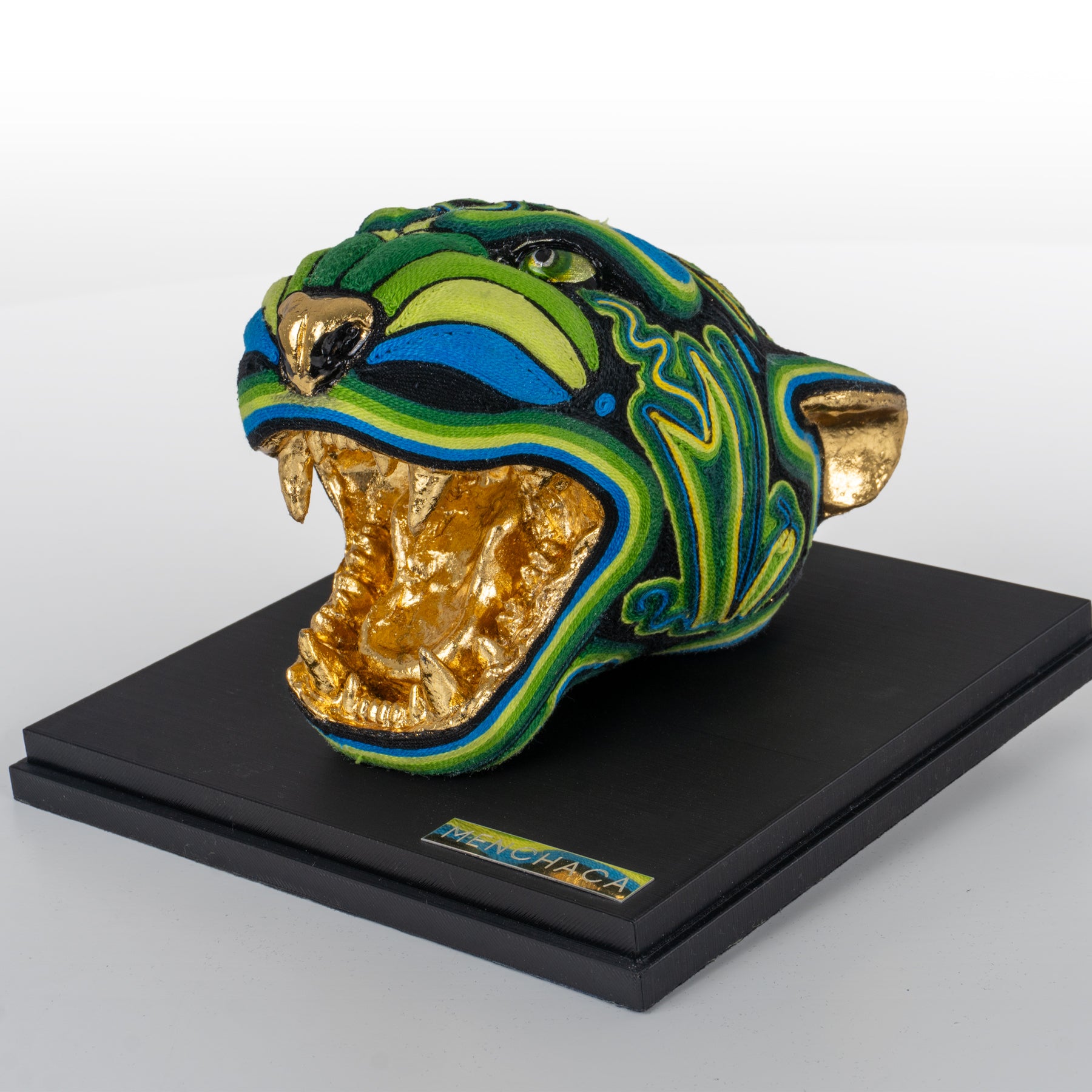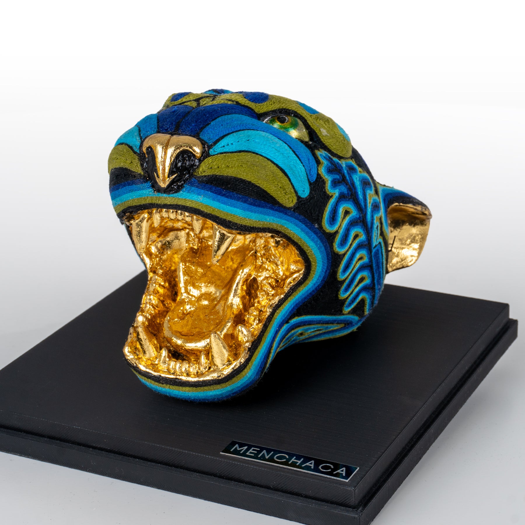Escultura en resinas, intervenida con estambre y aplicaciones de hoja de oro.