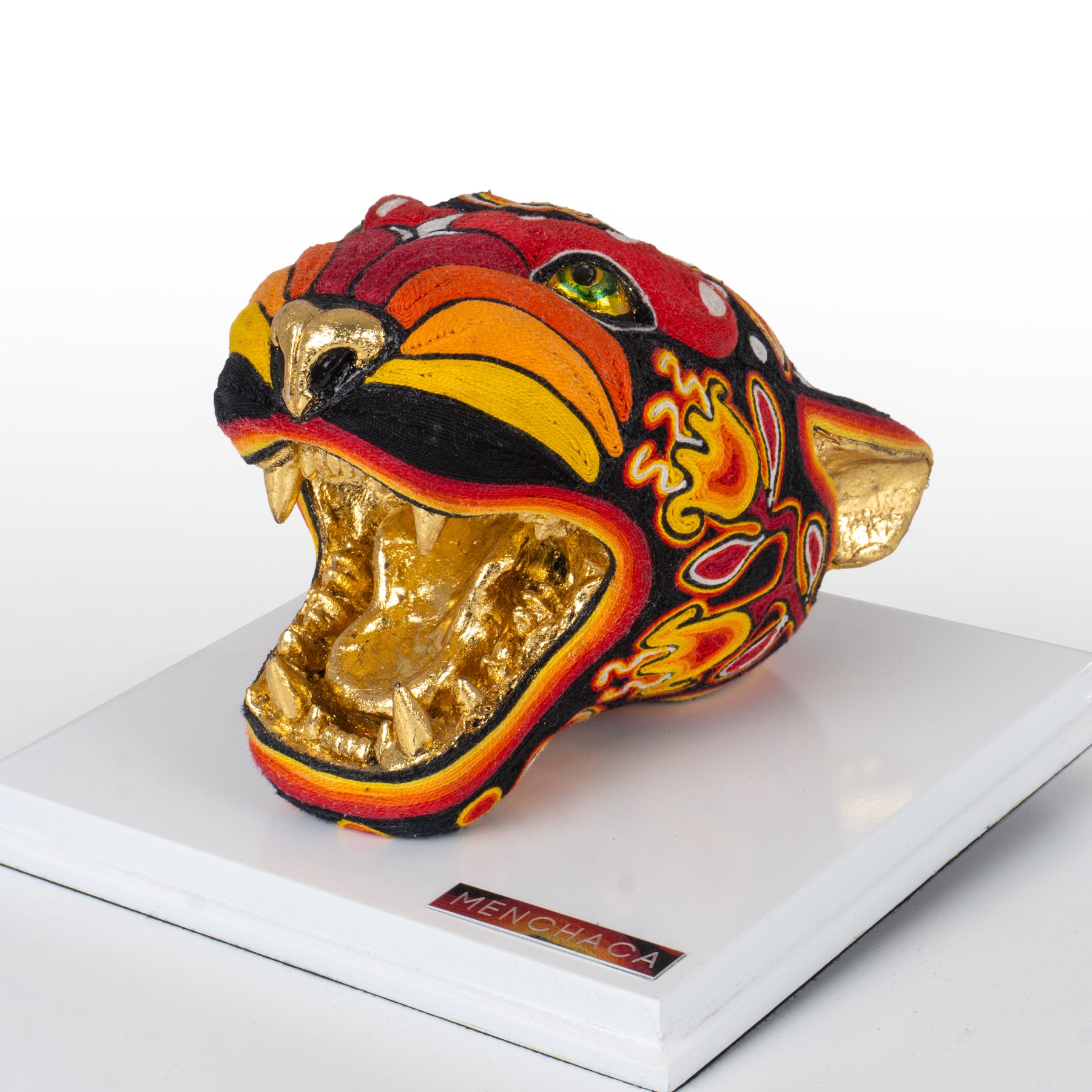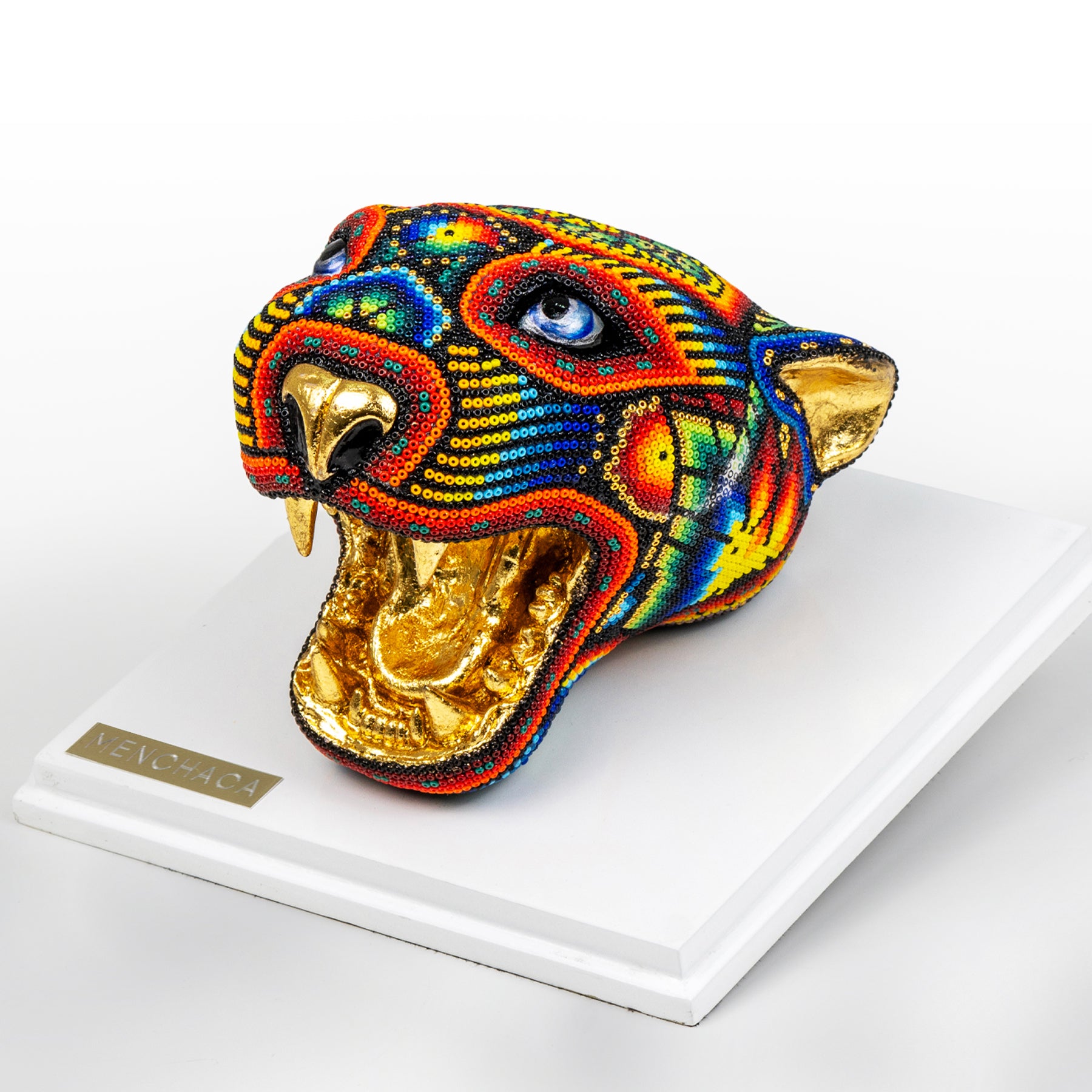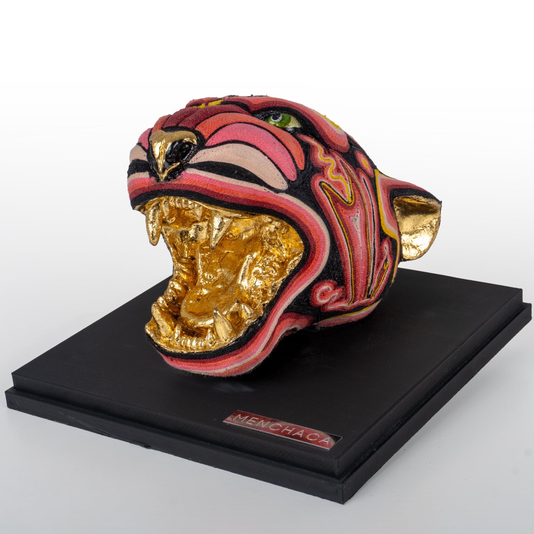 Escultura en resinas, intervenida con estambre y aplicaciones de hoja de oro.