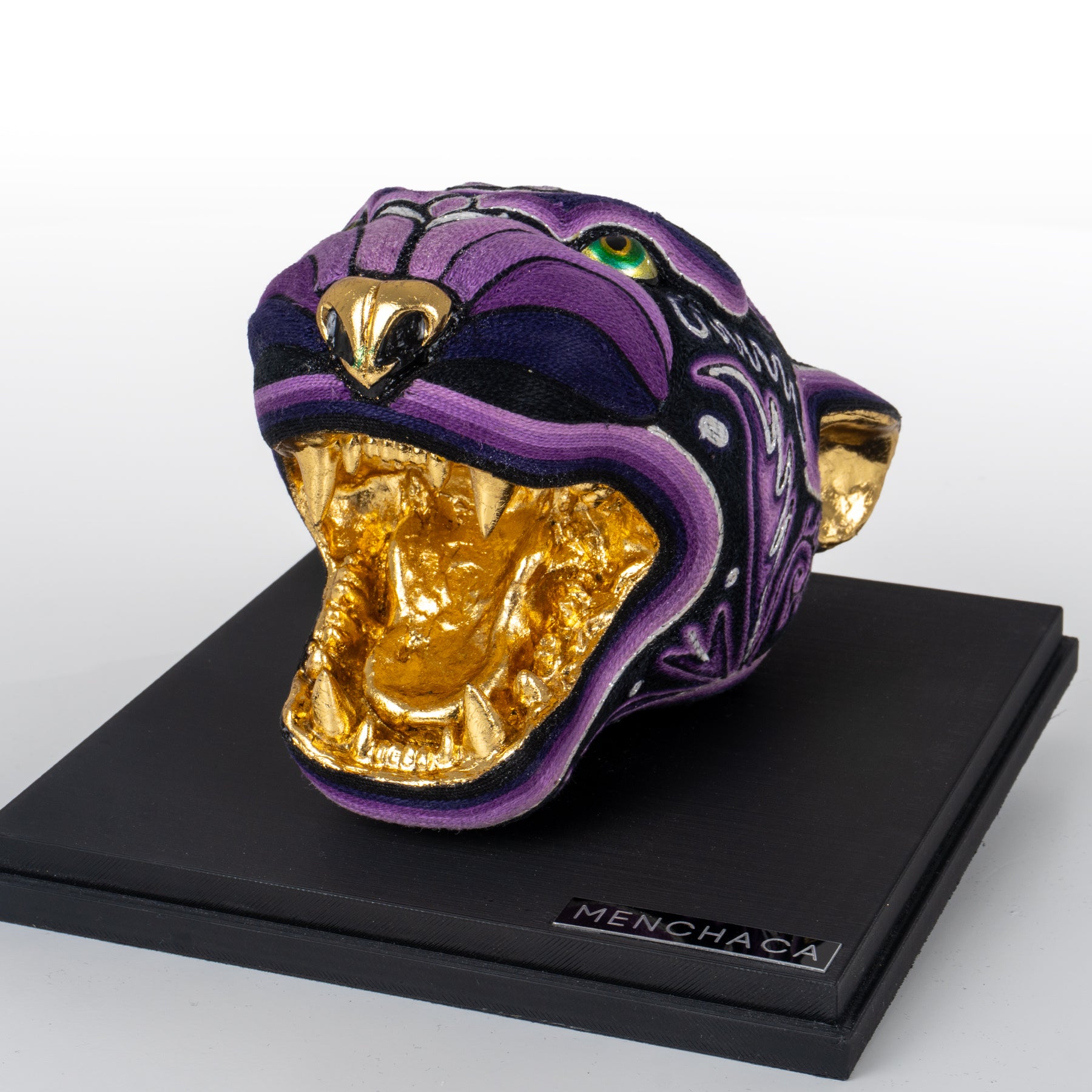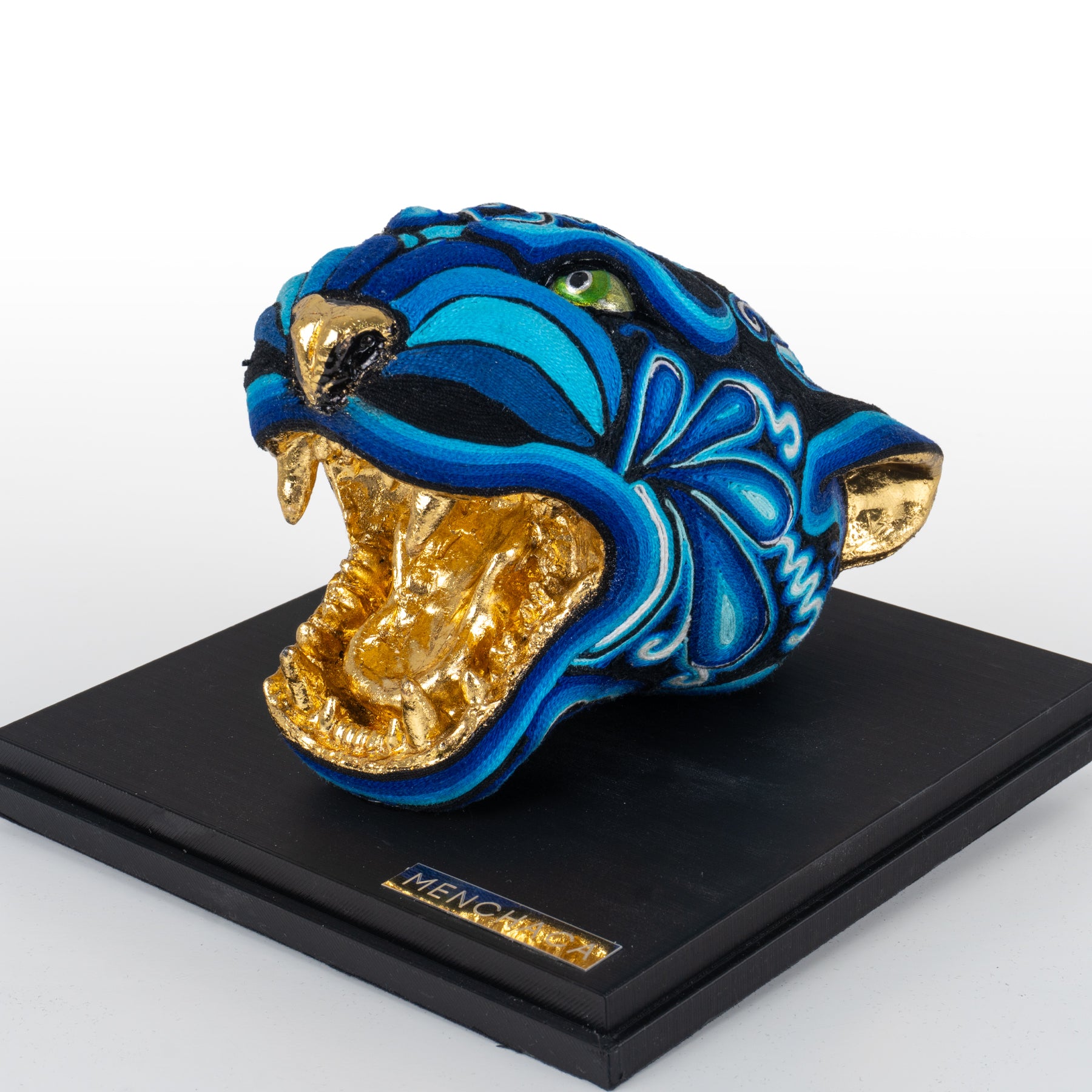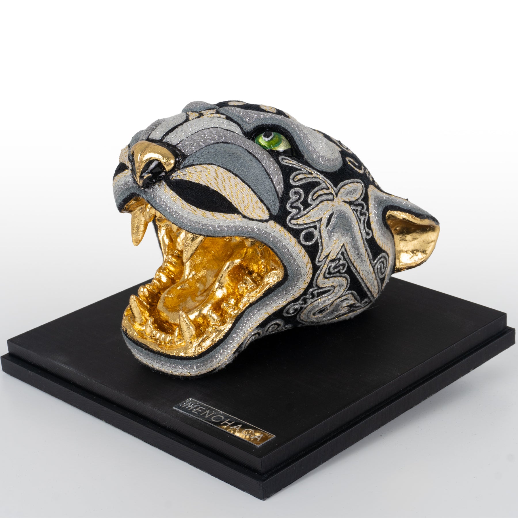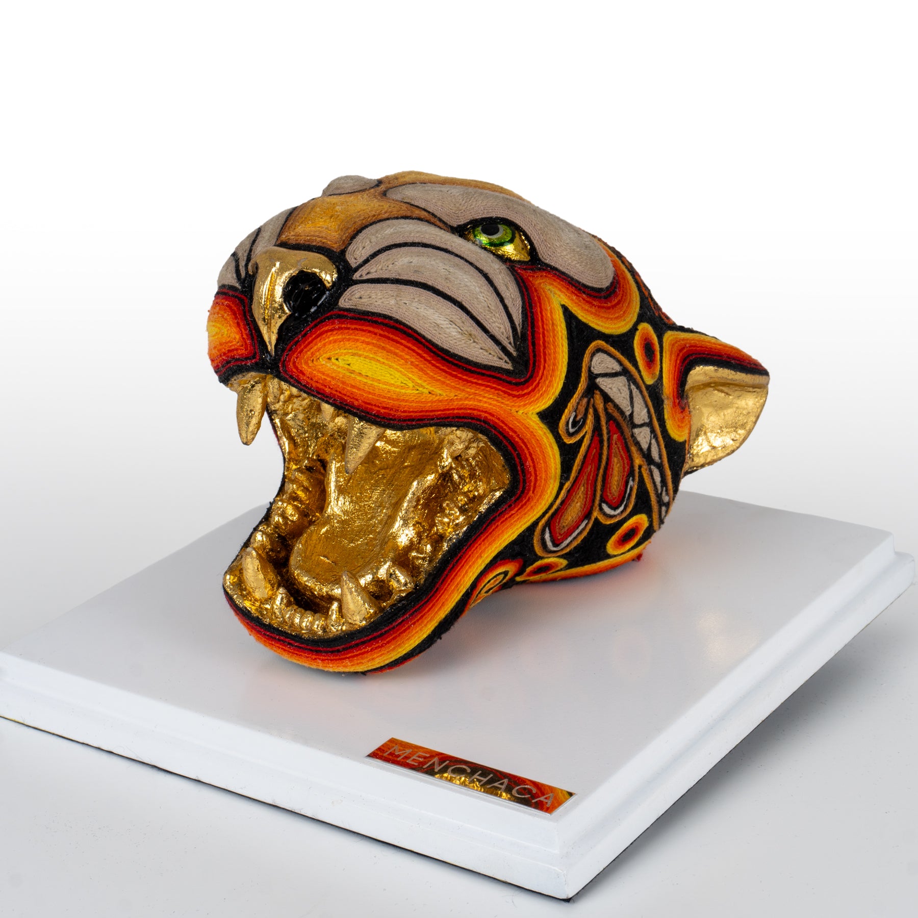 Escultura en resinas, intervenida con estambre y aplicaciones de hoja de oro.
