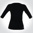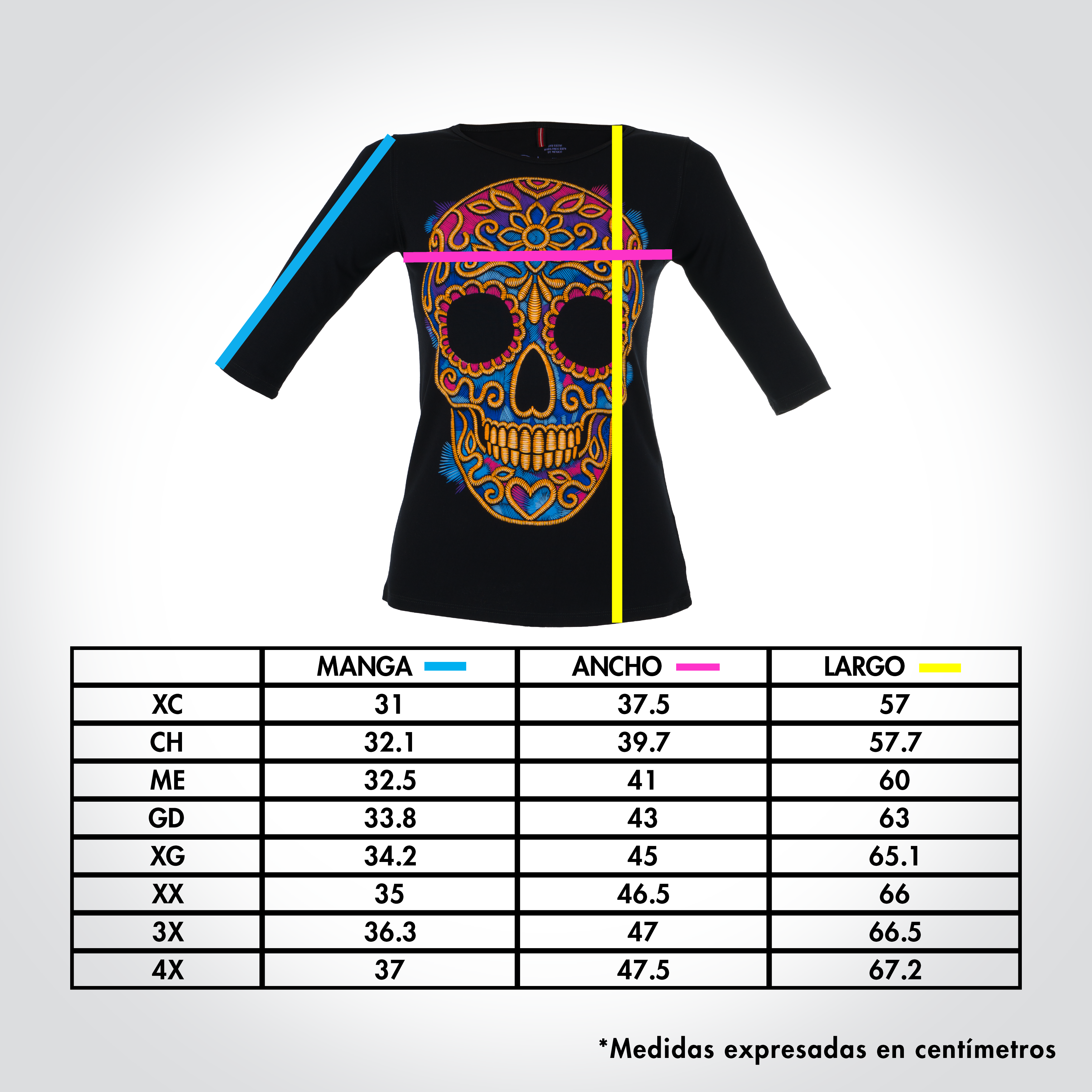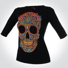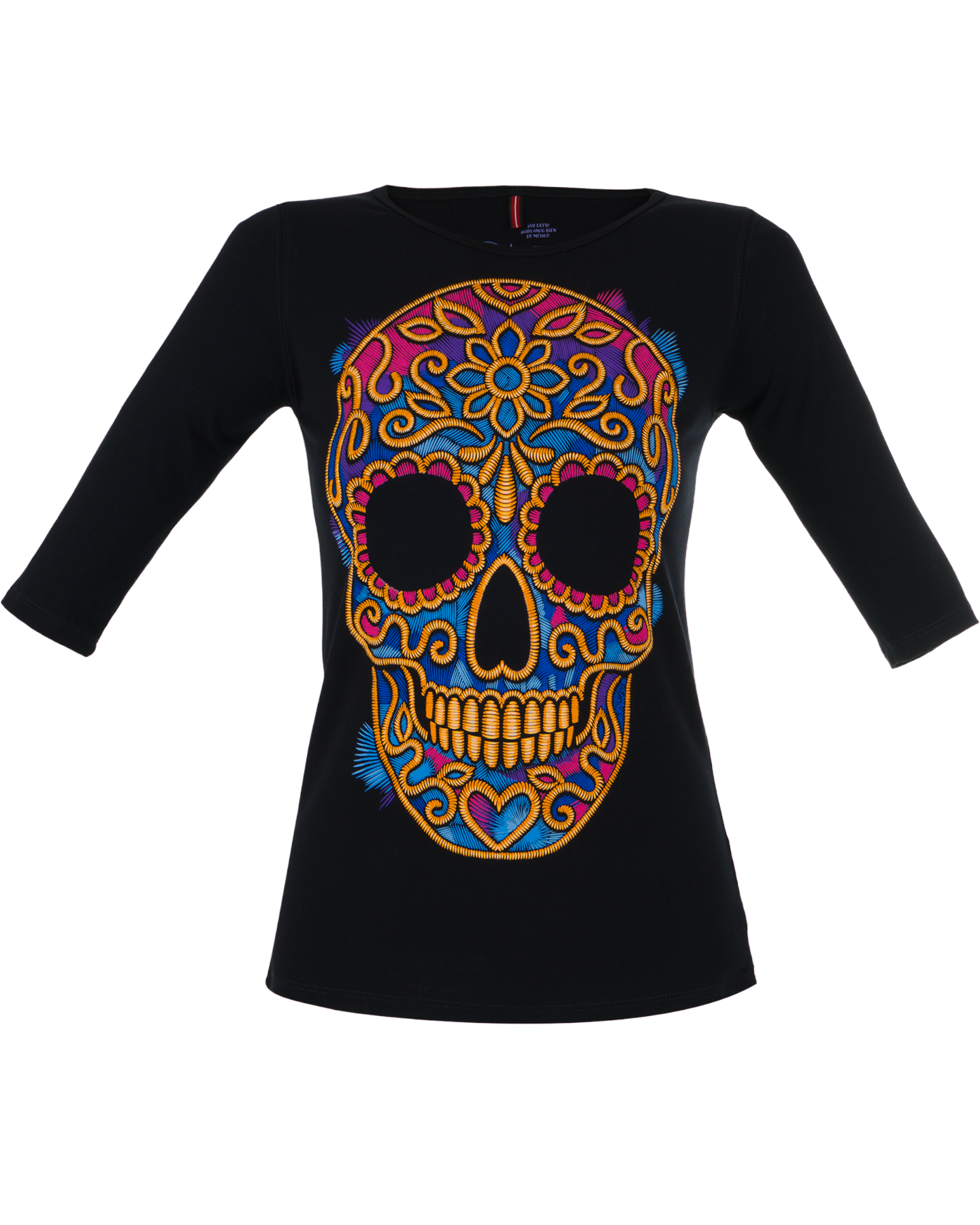 Playera negra de dama con manga 3/4 inspirado en las calaveras mexicanas, los bordados típicos mexicanos y el diseño toma sus colores de las dalias mexicanas, considerada una de las flores mexicanas más hermosas.