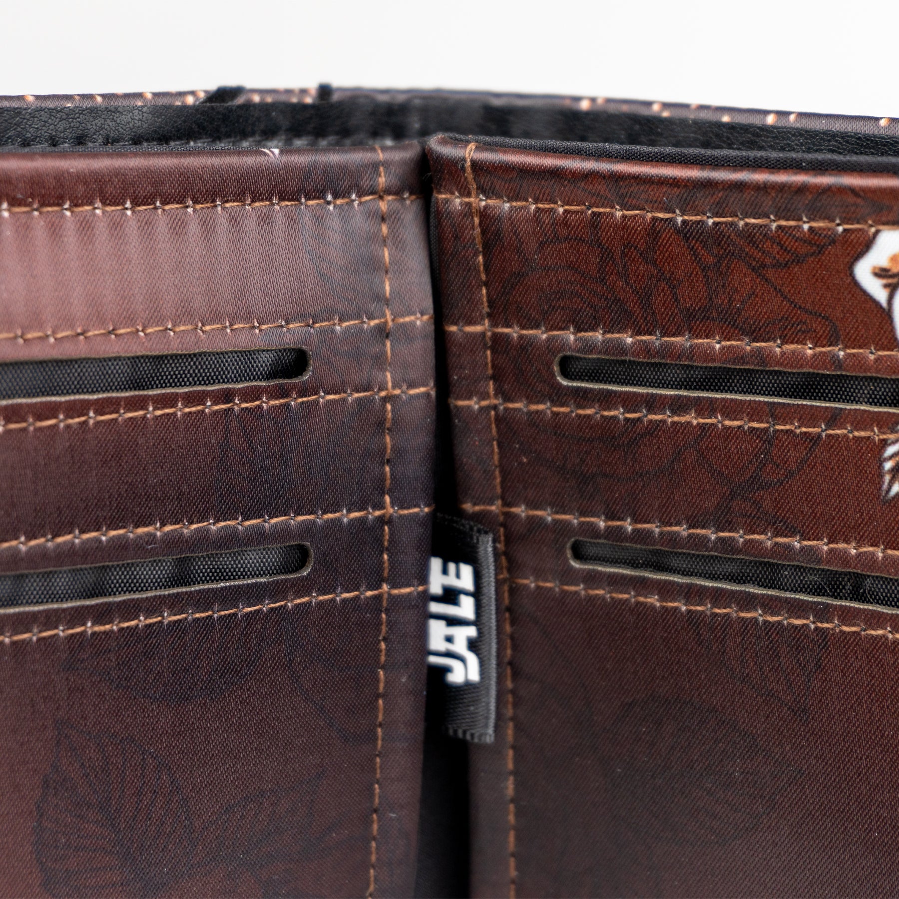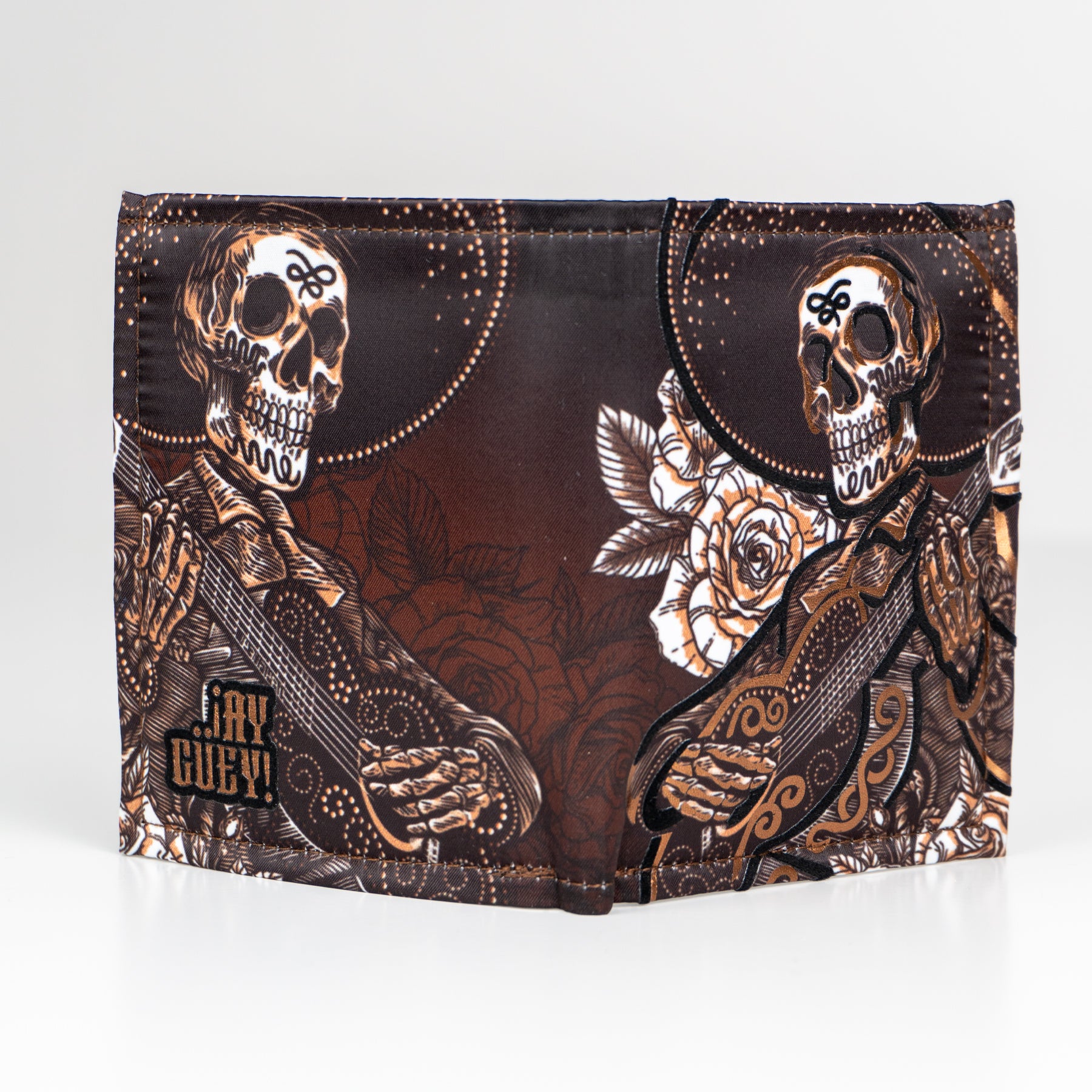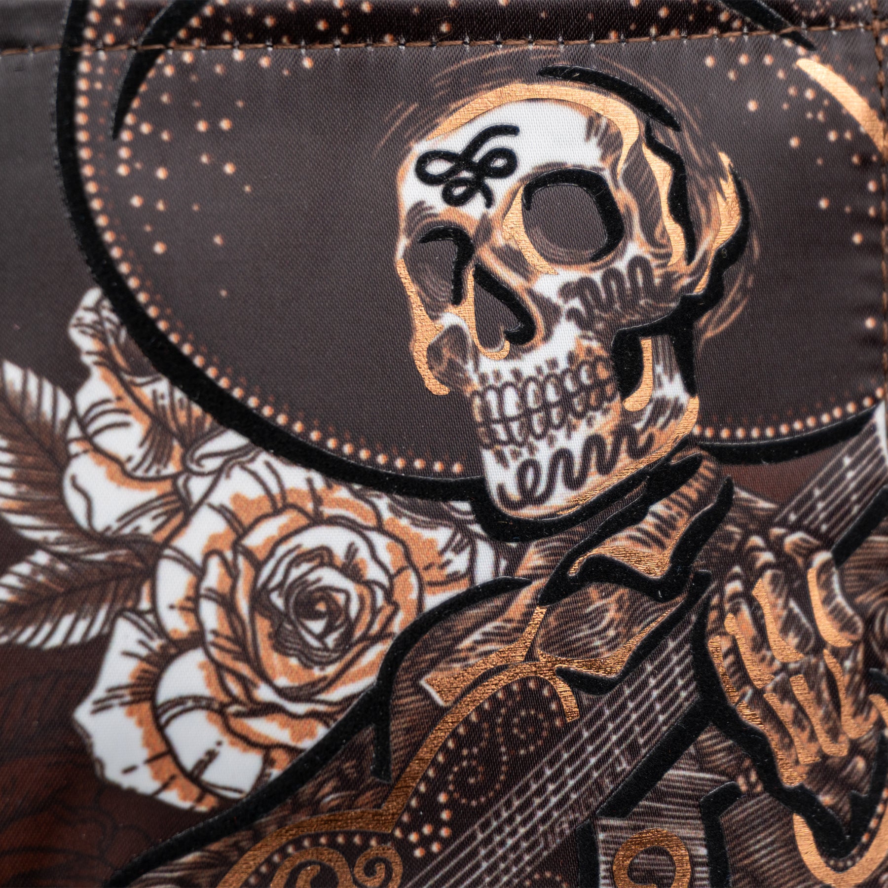 Billetera full print con aplicaciones de vinil metalizado y flock.