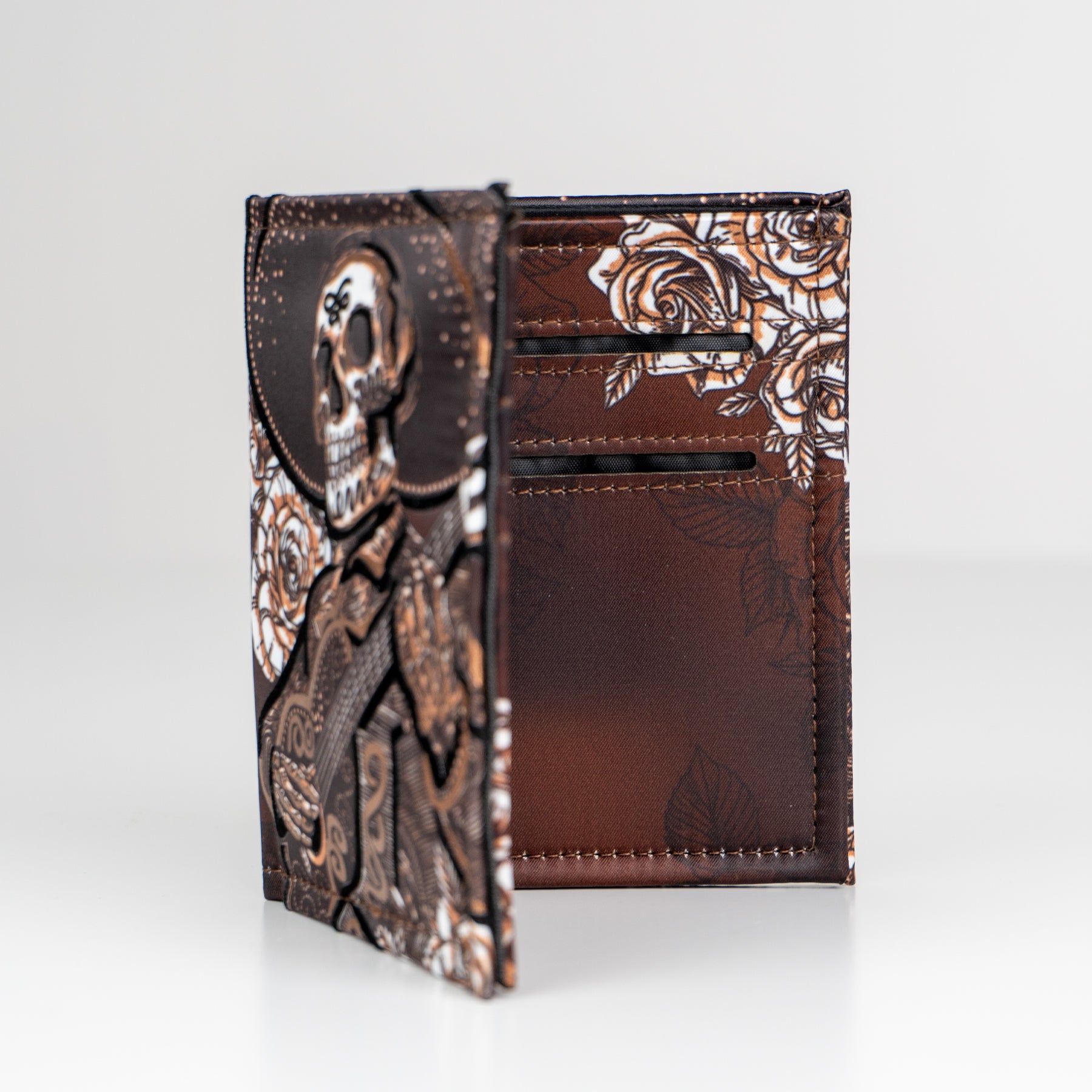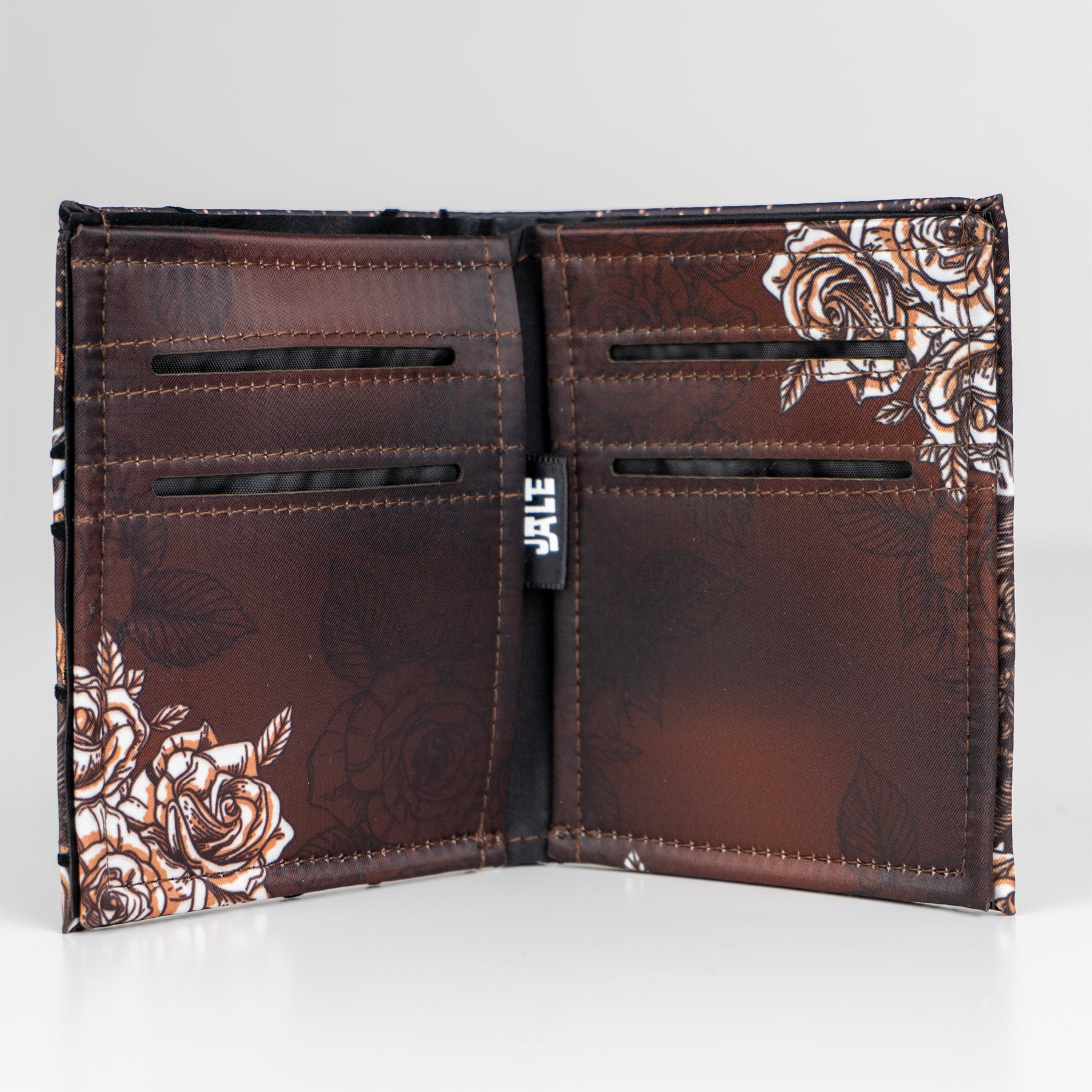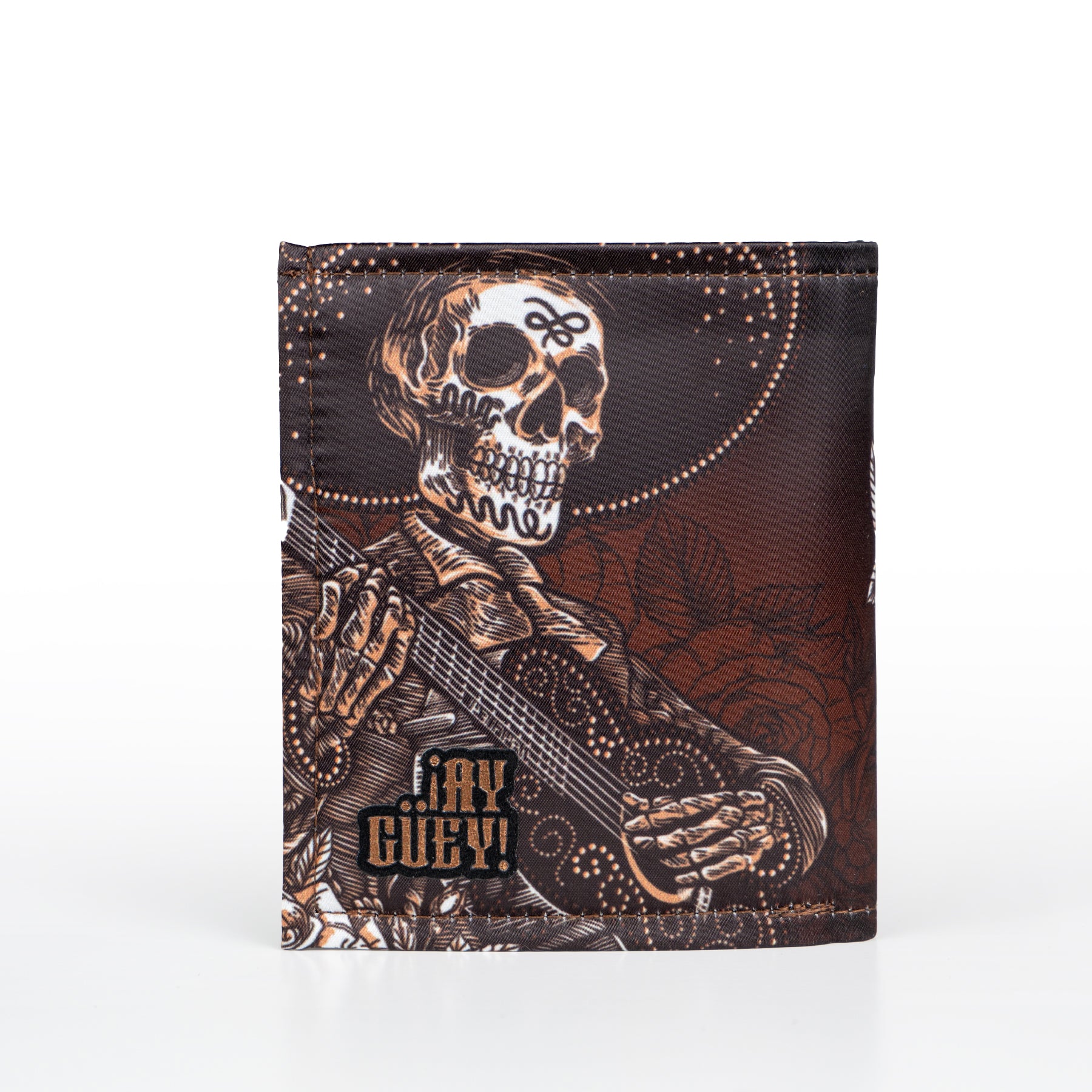 Billetera full print con aplicaciones de vinil metalizado y flock.