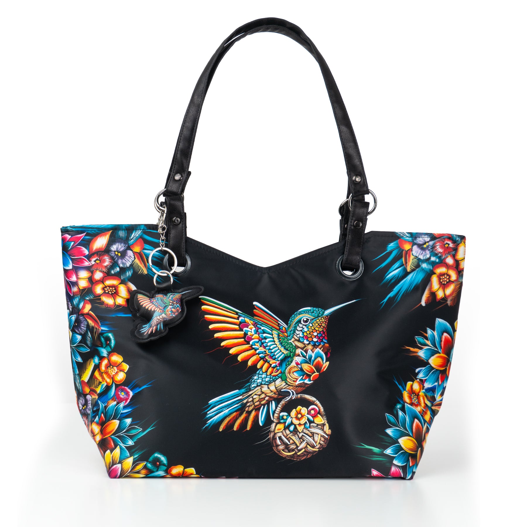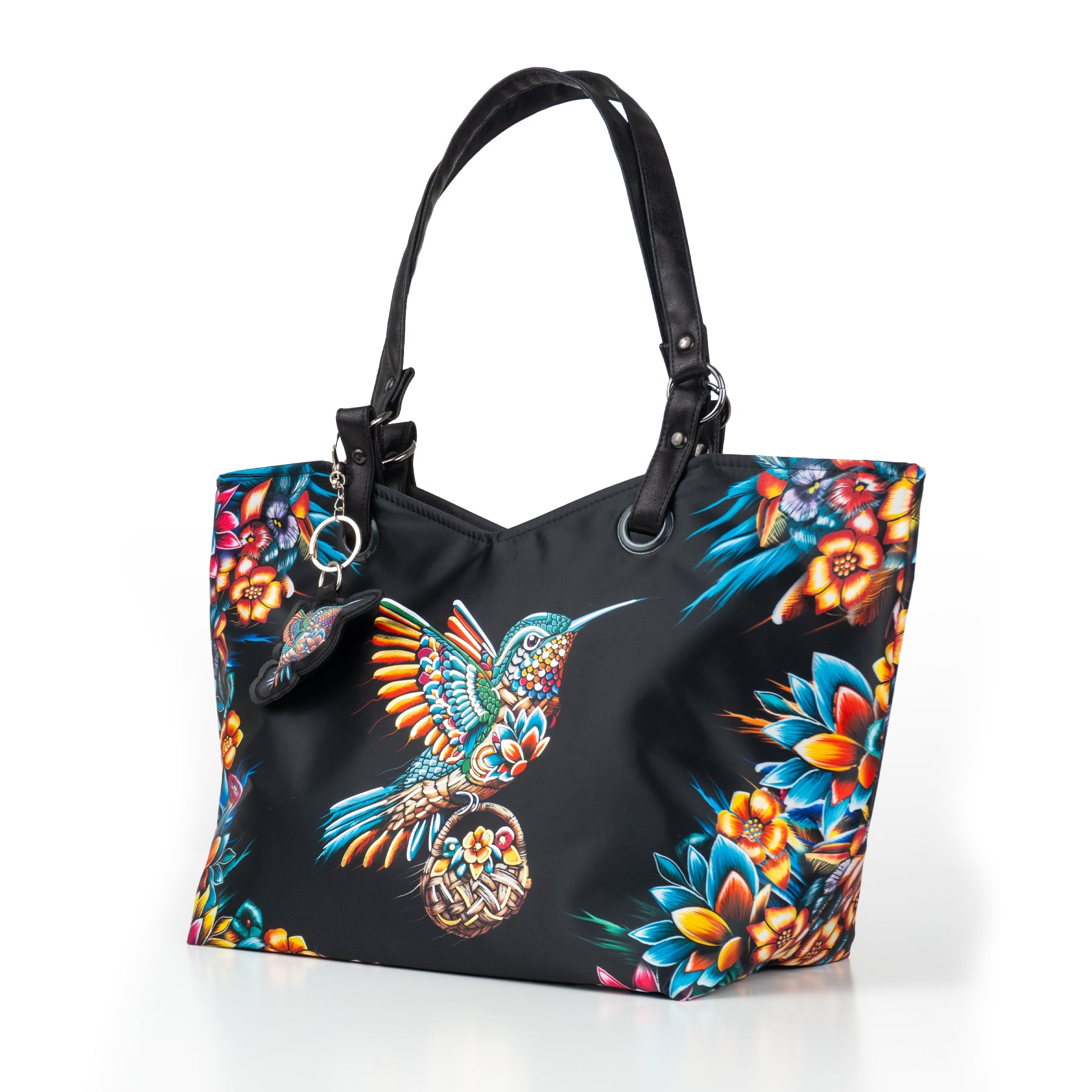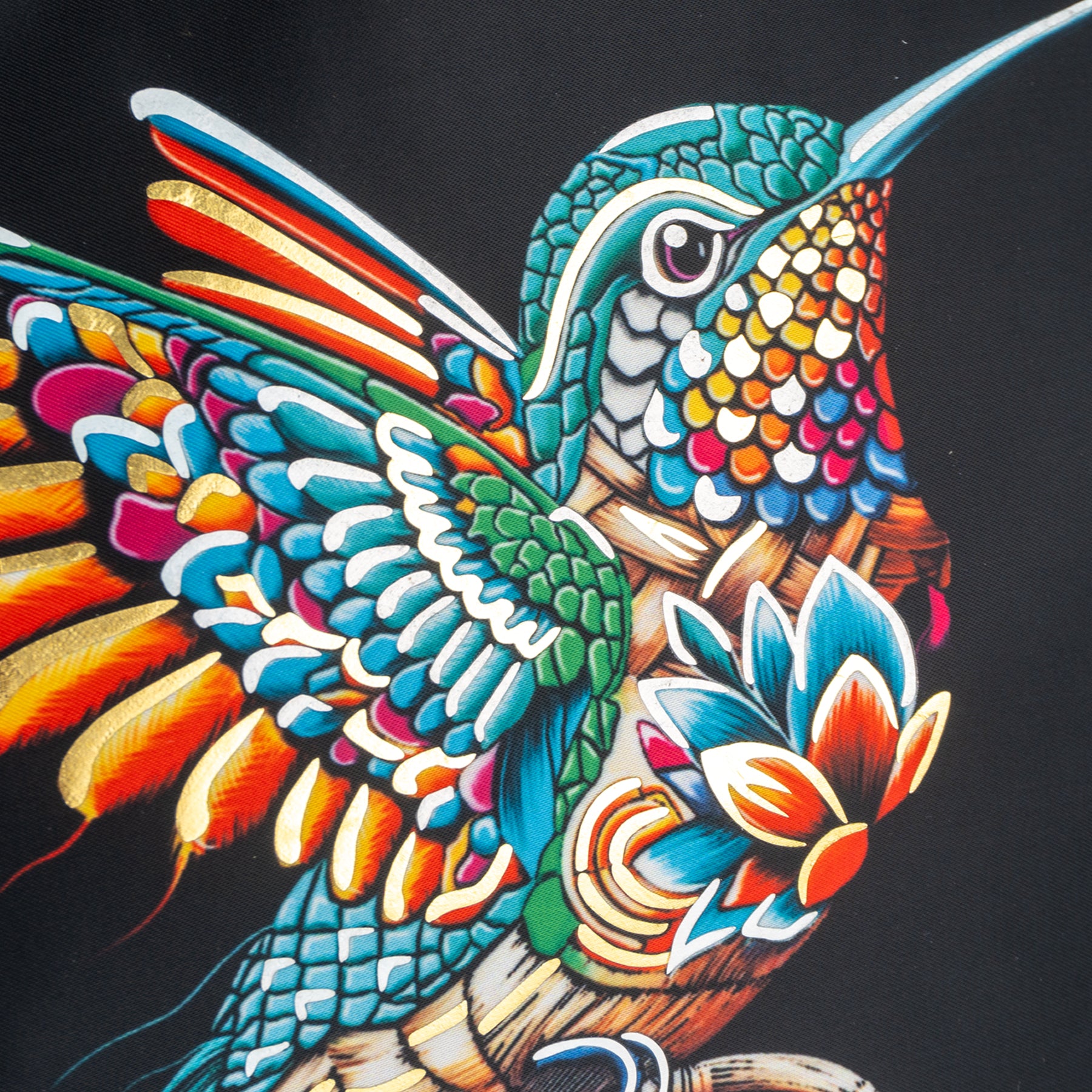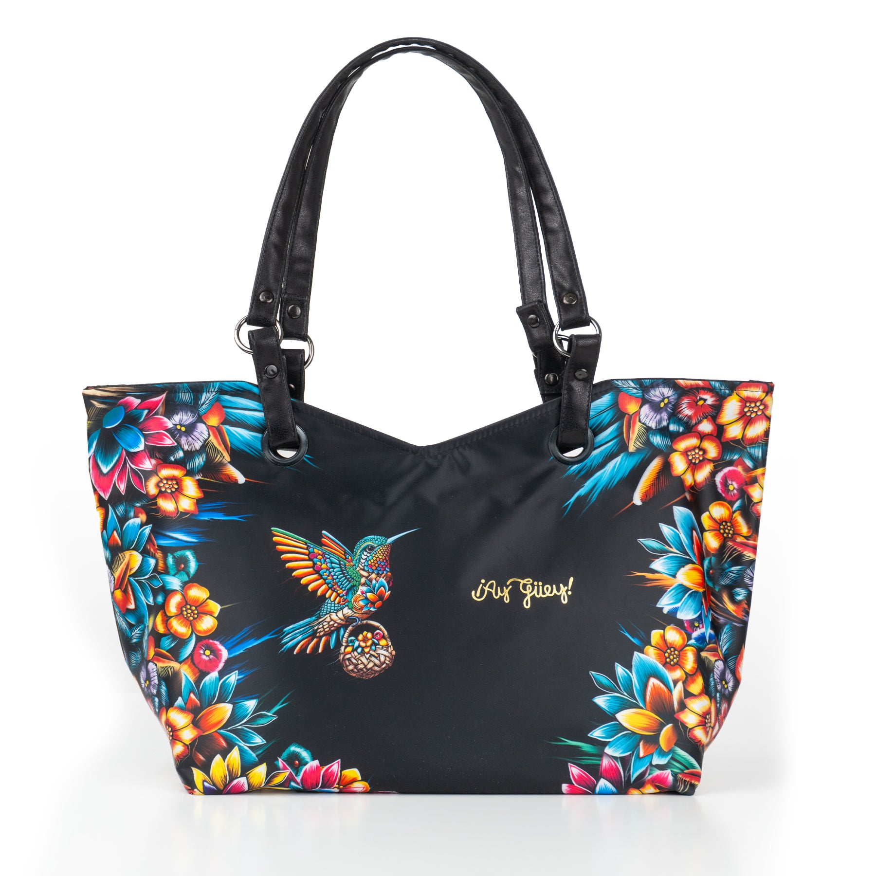 Esta bolsa de tela, parte de nuestra colección IZAHUATL, es perfecta para las mujeres con estilo. Cuenta con asas y aros para facilitar su transporte, además de un hermoso diseño de colibrís y flores. No solo te ayudará a llevar tus pertenencias, sino que también añadirá un toque elegante a cualquier outfit.