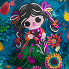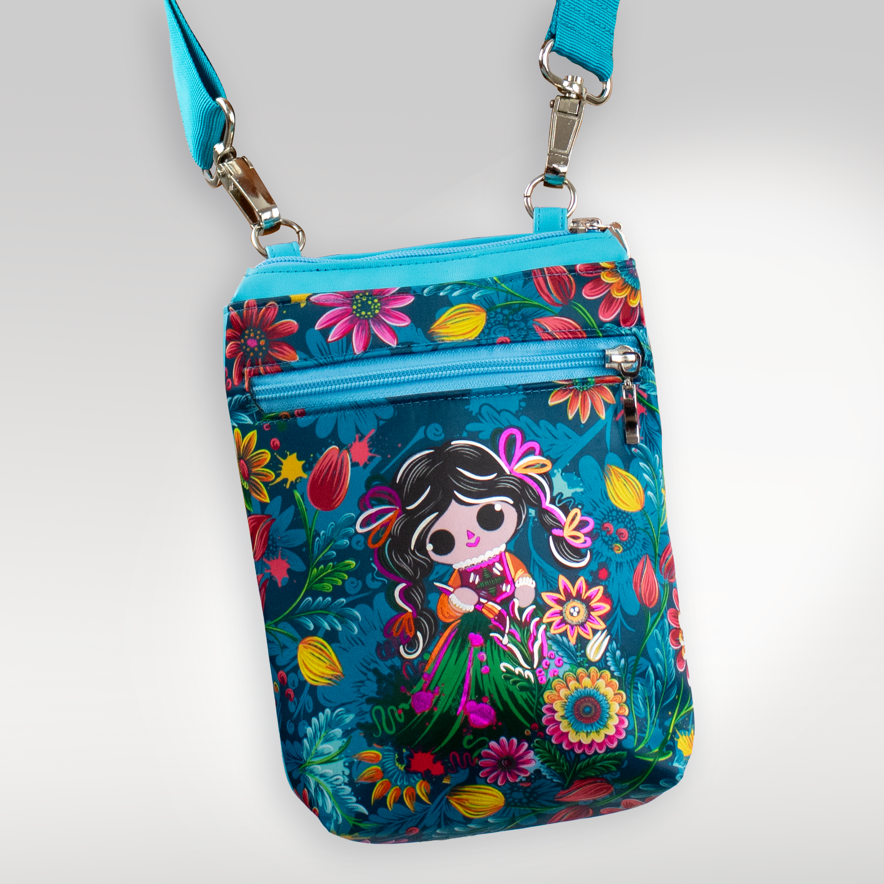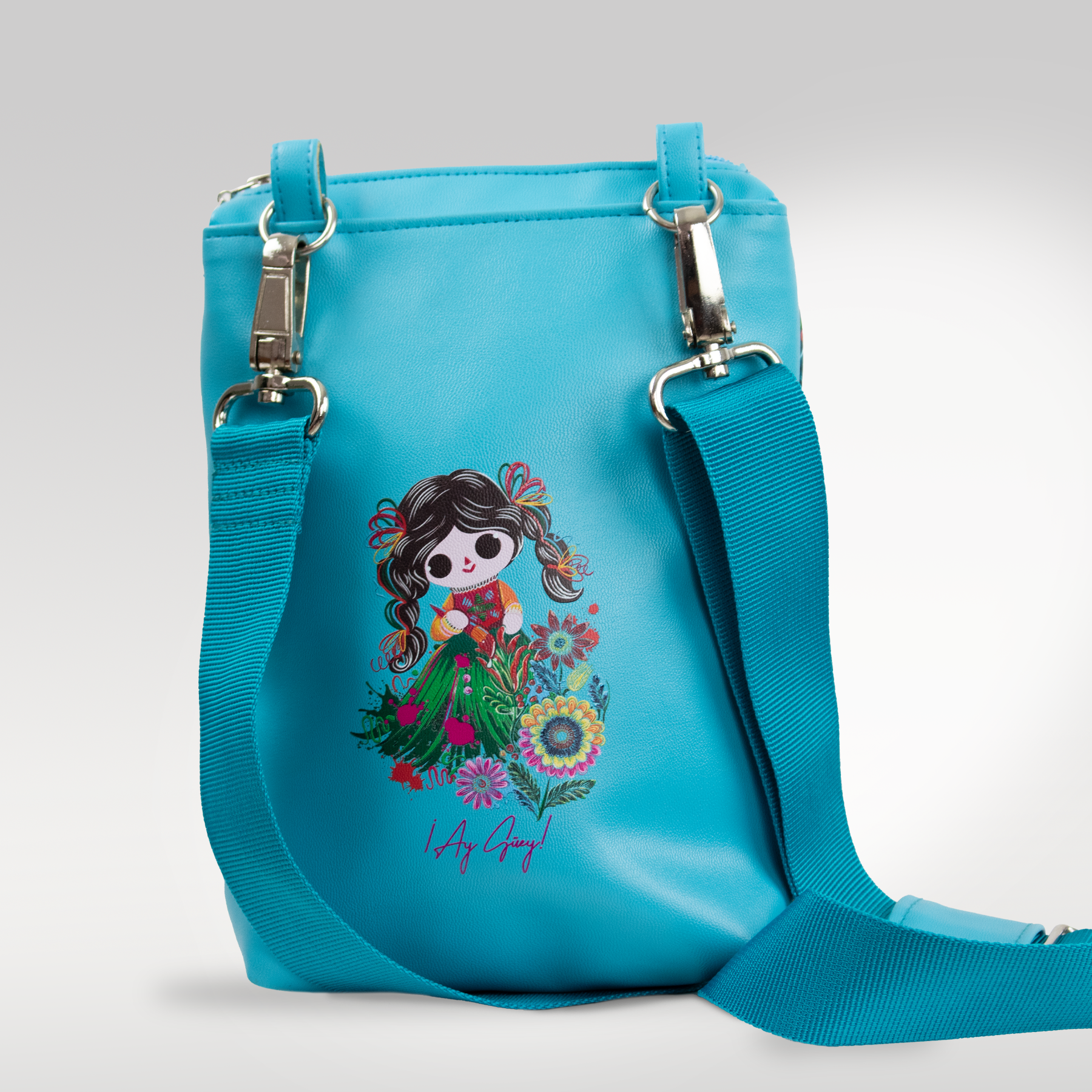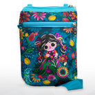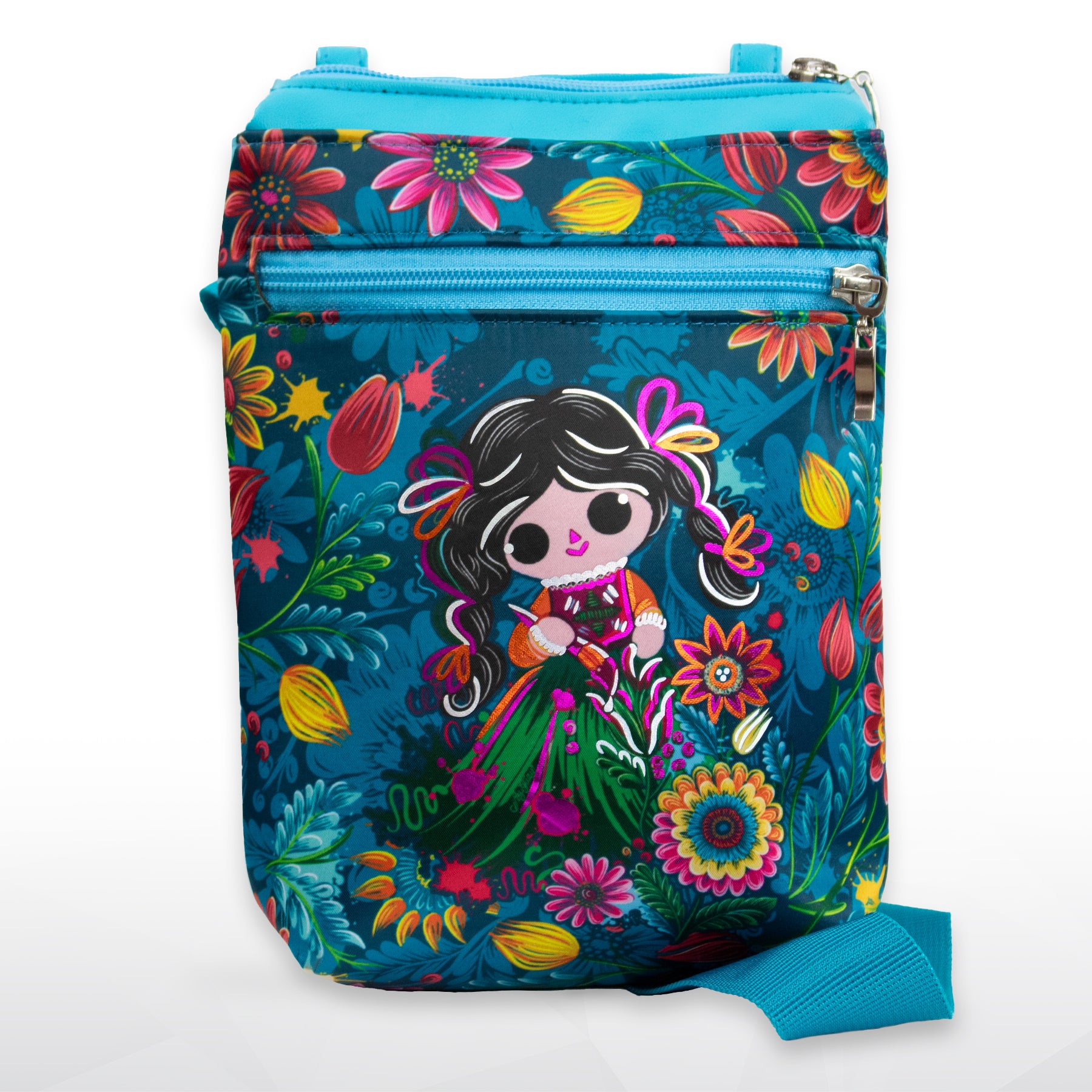 Mochila tipo bandolera, con correa de de tela, inspirada en nuestra interpretación de la muñeca mazahua "Petrita". Cuenta con aplicaciones de vinil metalizado.