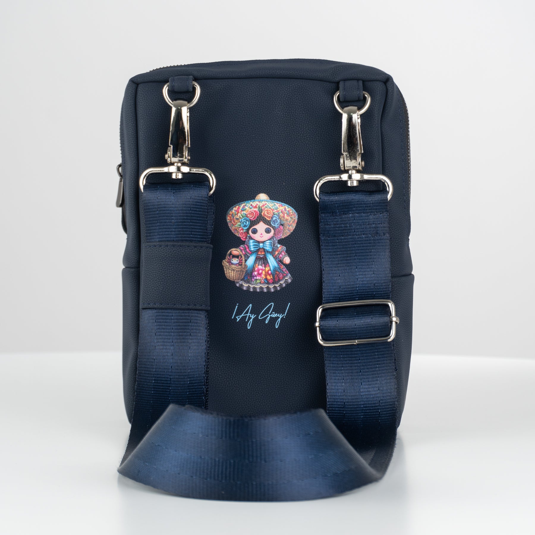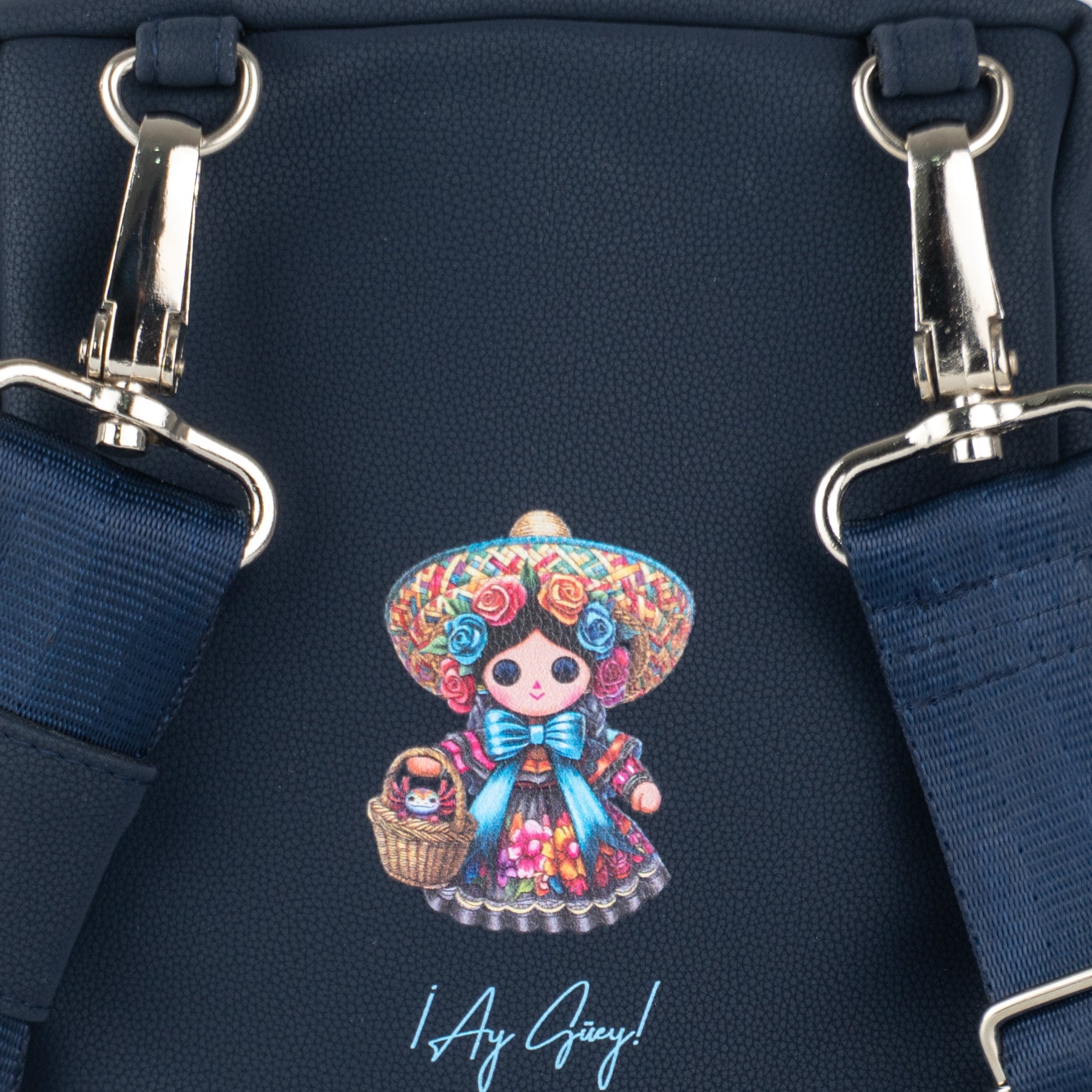 Mochila tipo bandolera, con correa de de tela, inspirada en Petrita, nuestra reinterpretación de la muñeca mazahua y en las artesanías elaboradas con hojas de maíz.