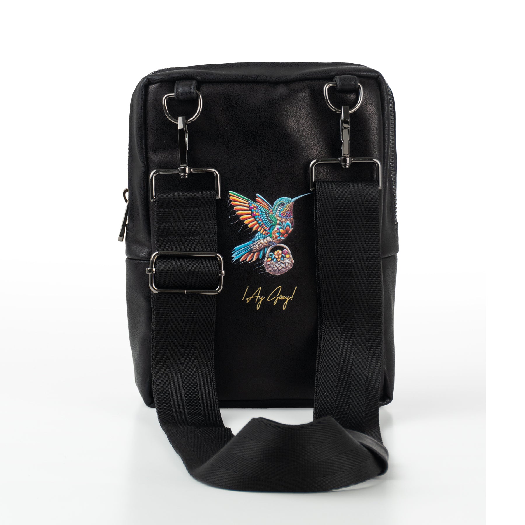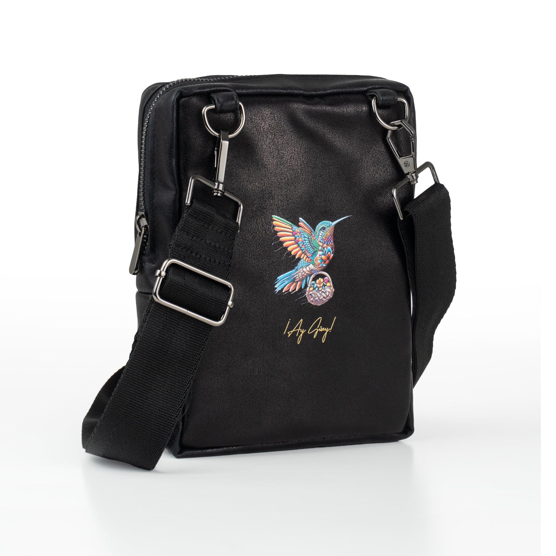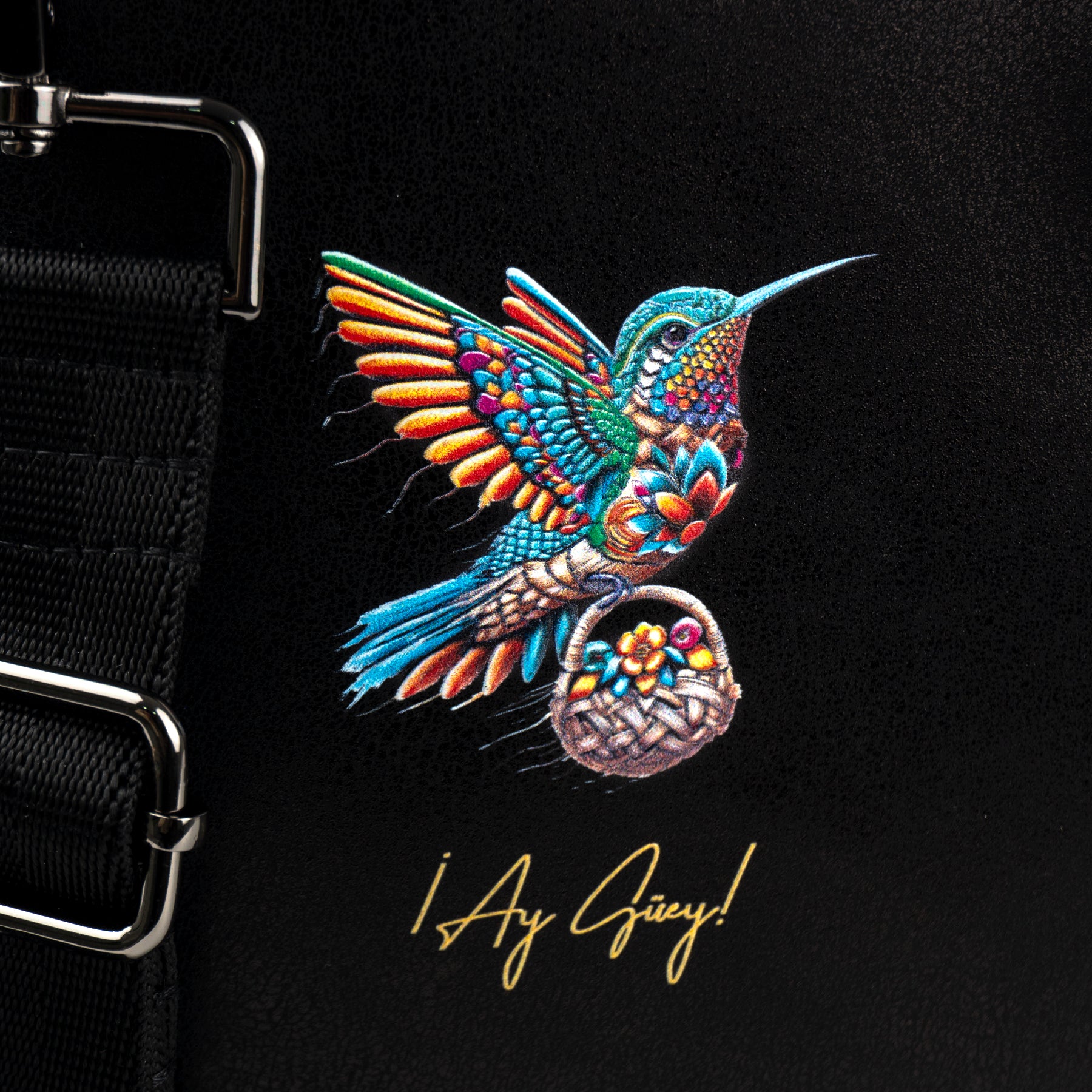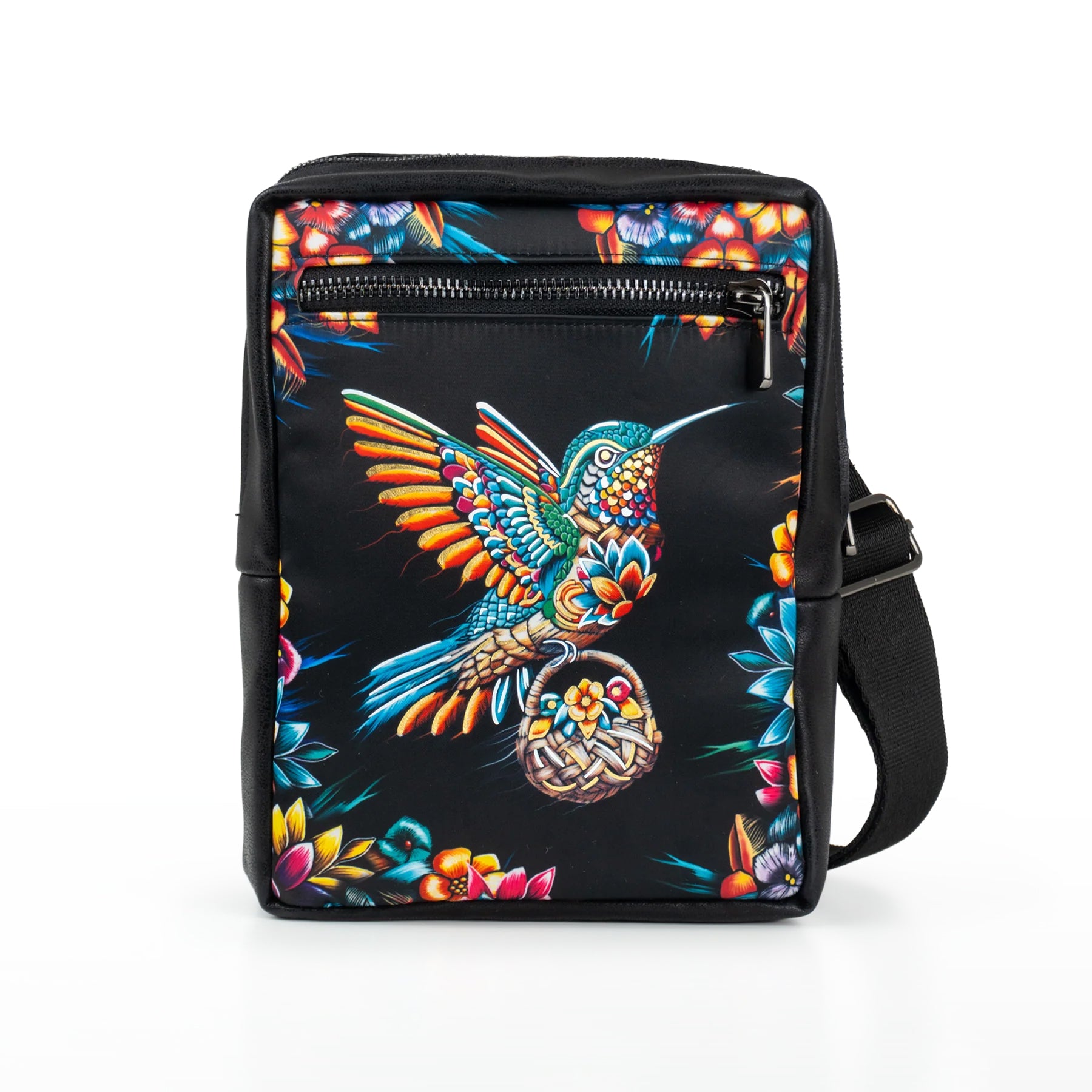 Mochila tipo bandolera, con correa de tela, inspirada en el colibrí y la primavera.