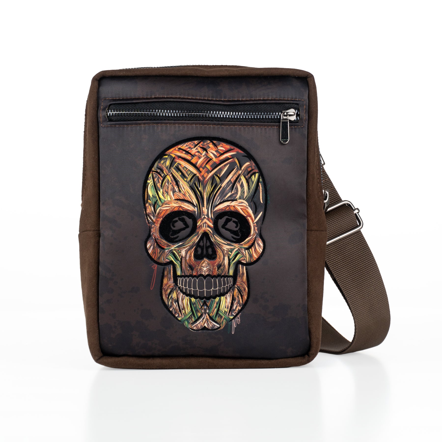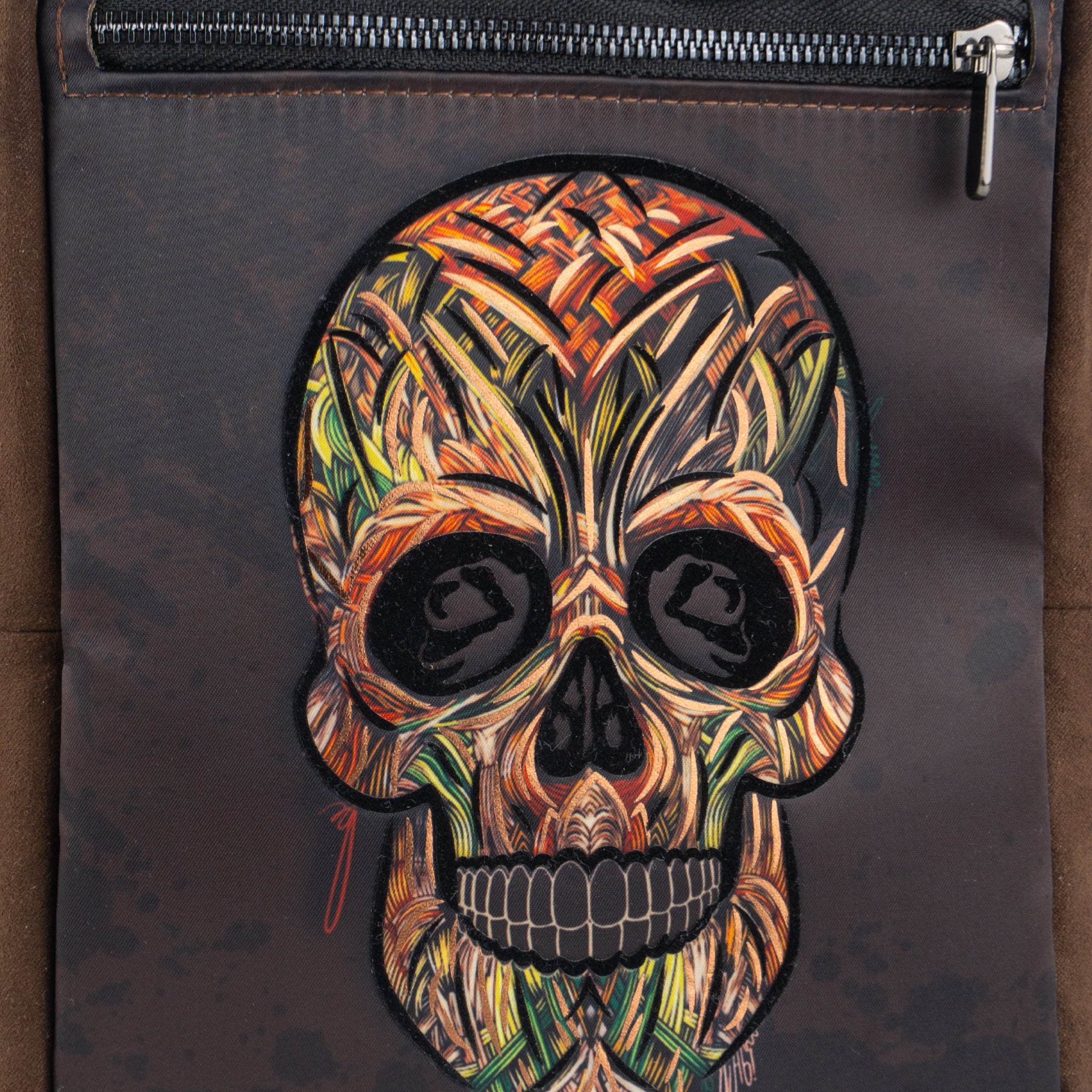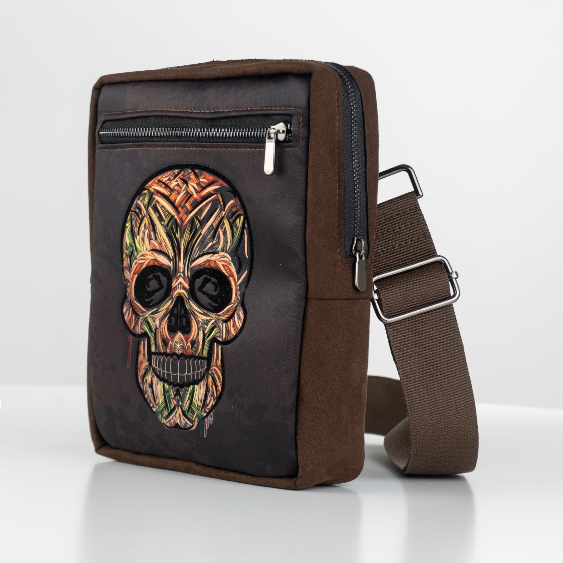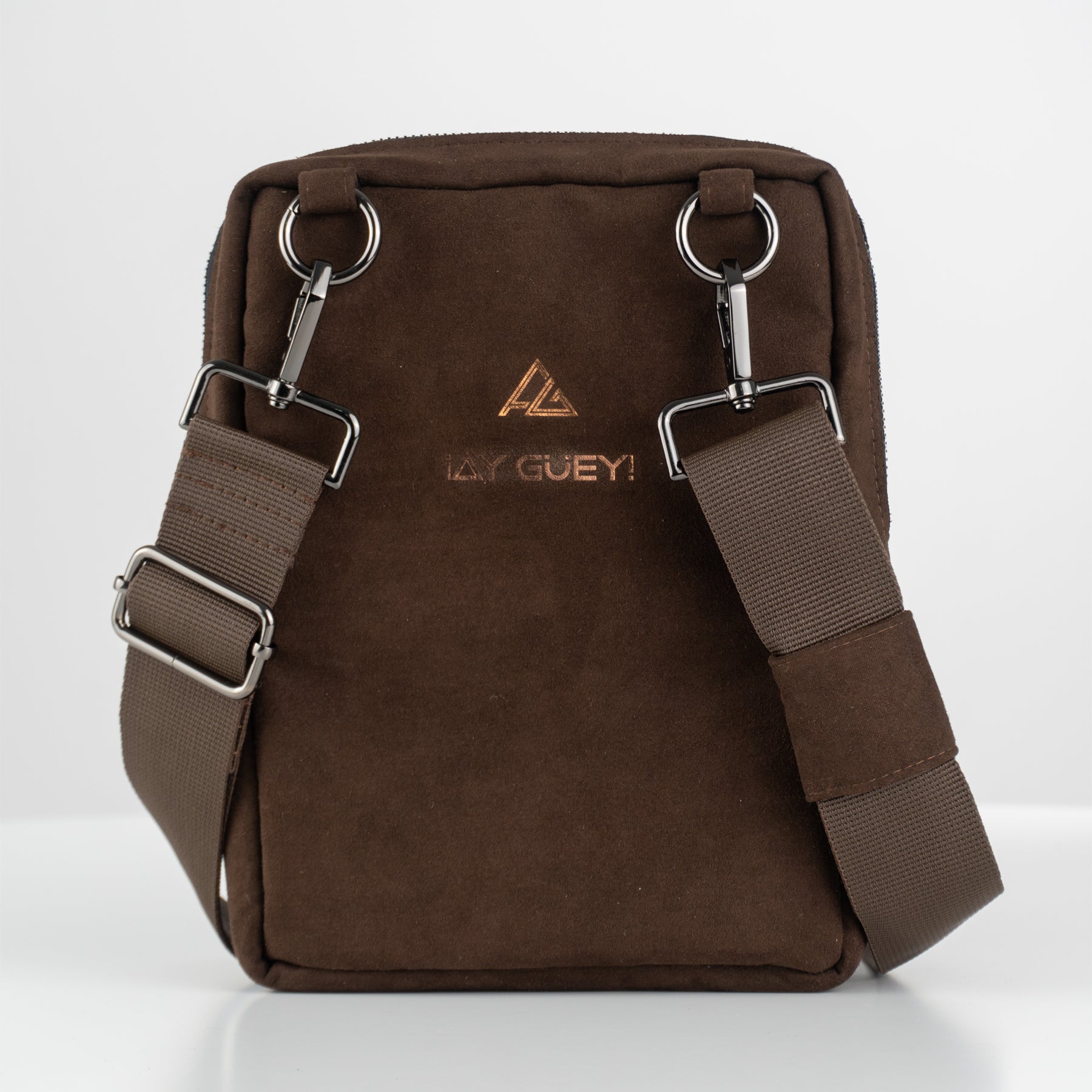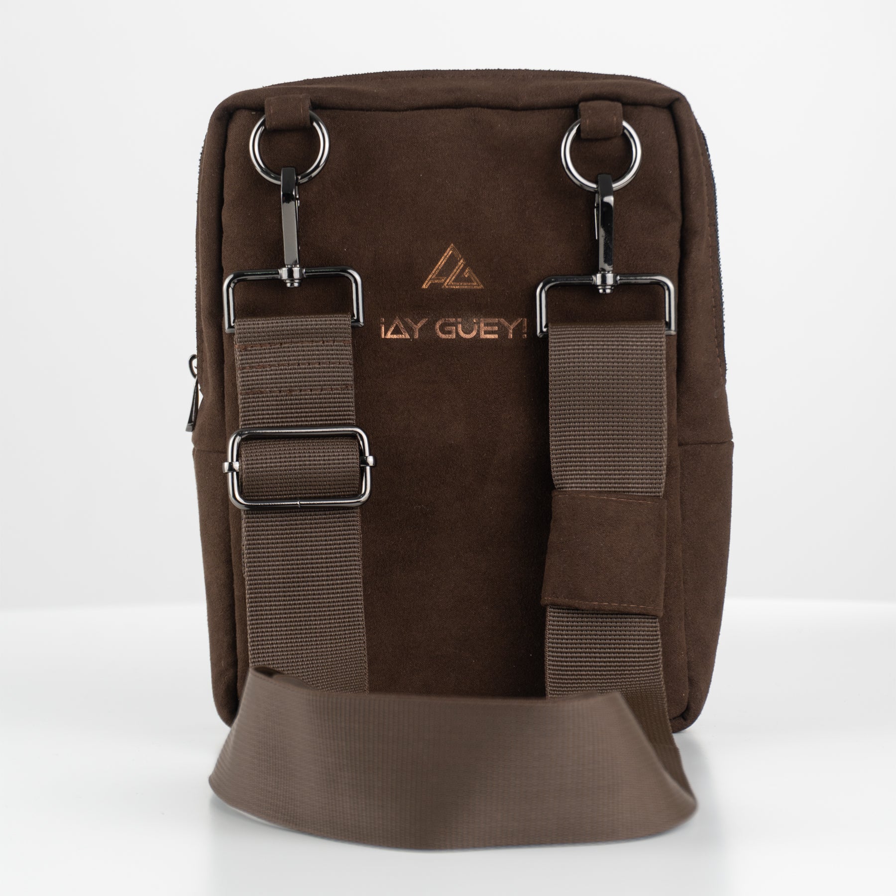 Mochila tipo bandolera, con correa de de tela, inspirada en las artesanías tejidas. Cuenta con aplicaciones de foil metalizado y flock, que le aporta textura de terciopelo a diversas áreas del diseño.