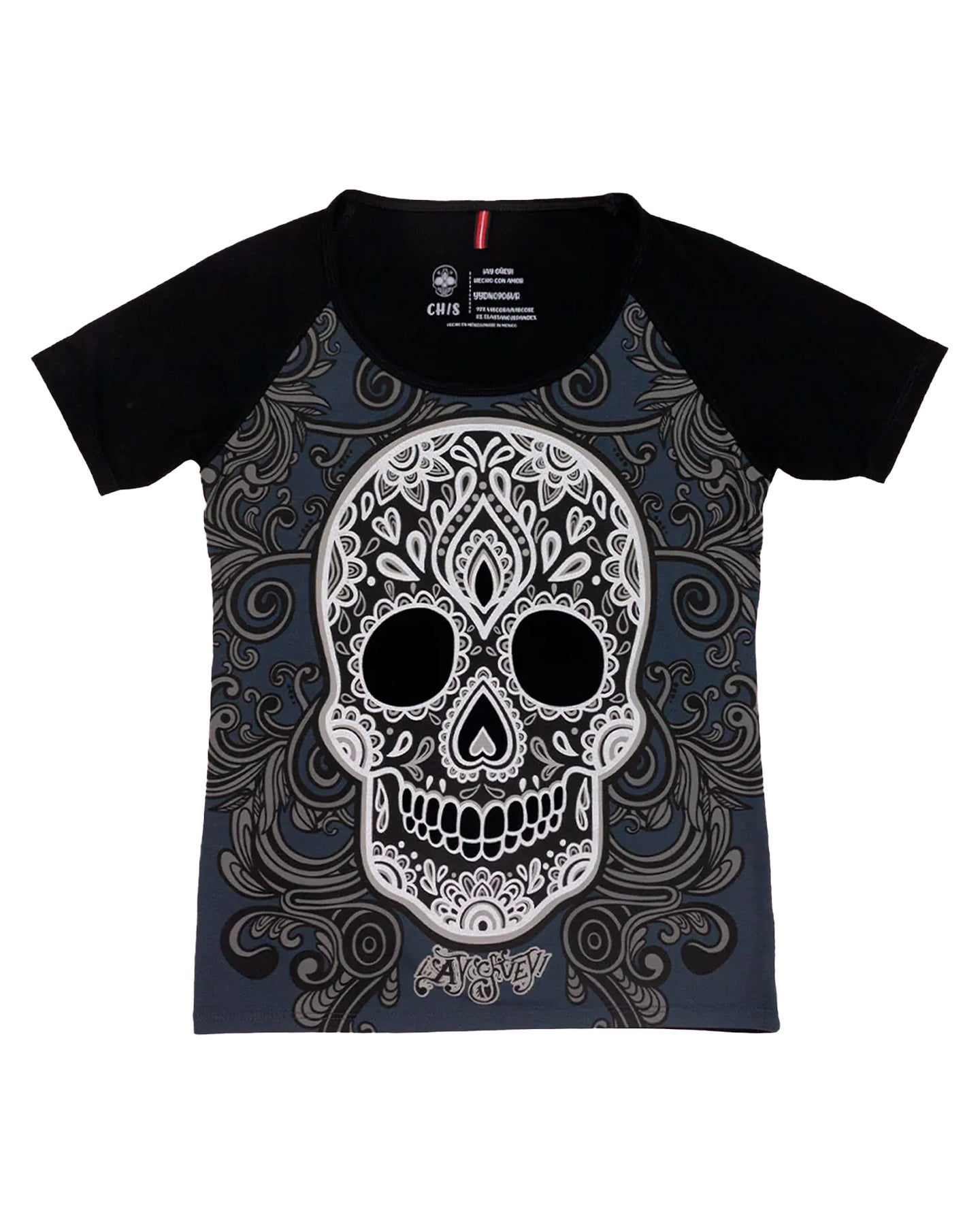 El dibujo tiene motivos modernos incorporados en la calavera de azúcar y el corte tiene manga ranglan para un fit distinto al que usamos siempre.