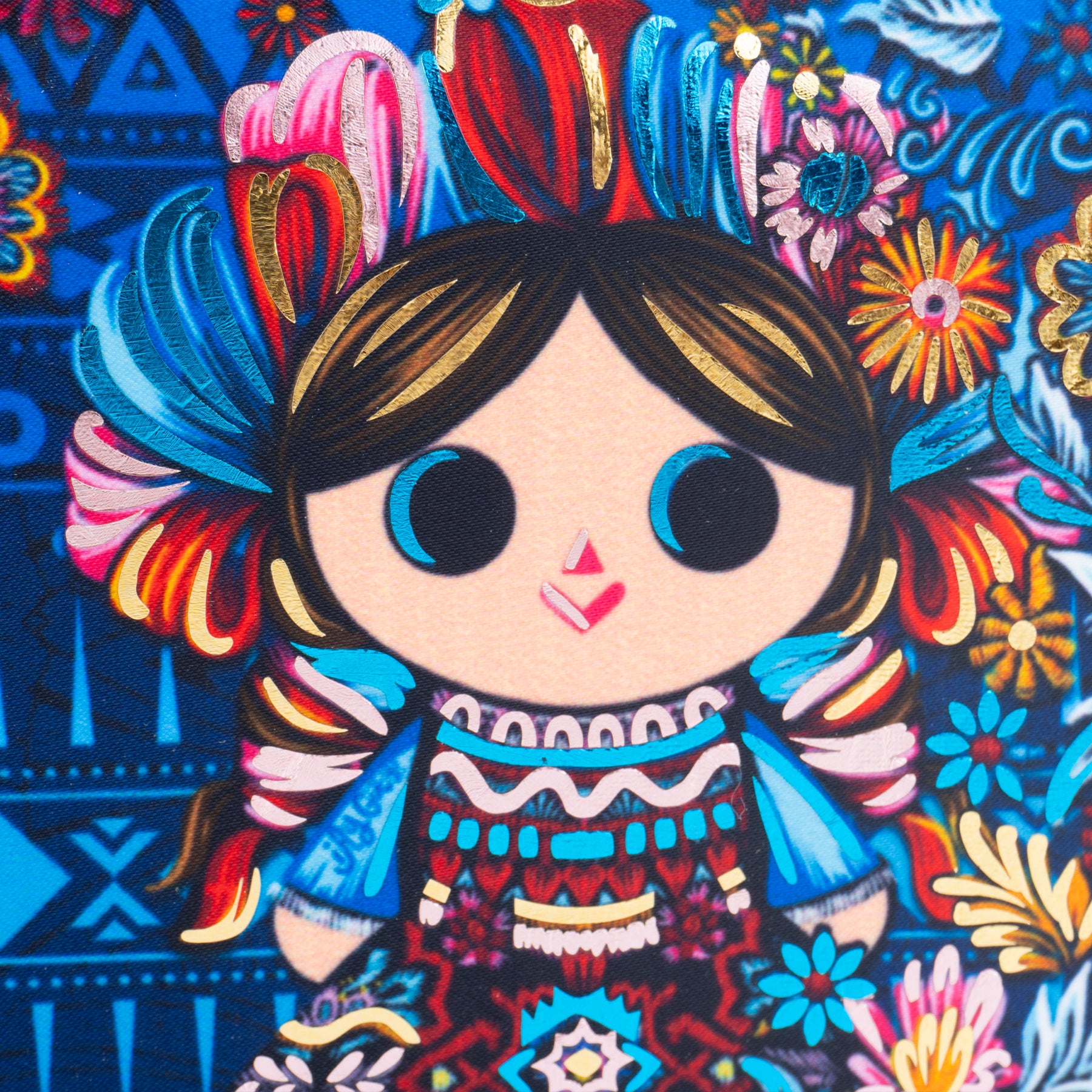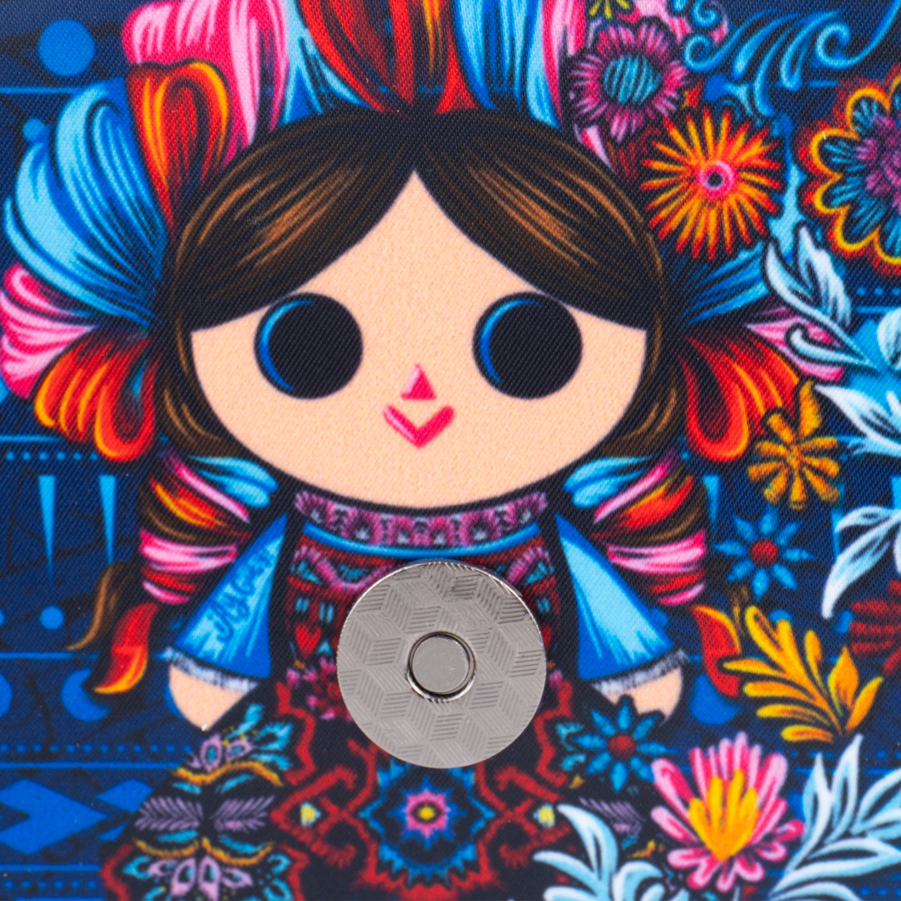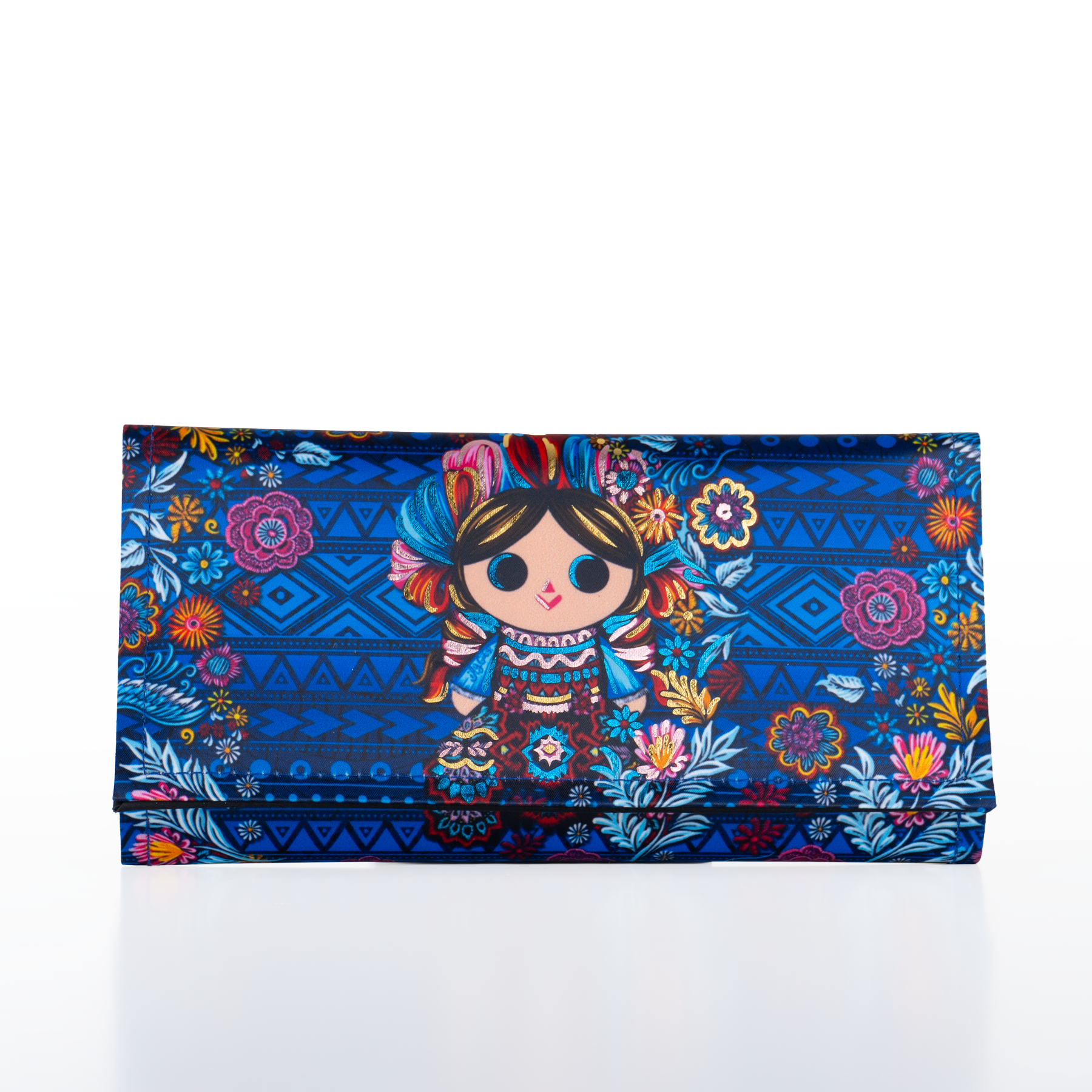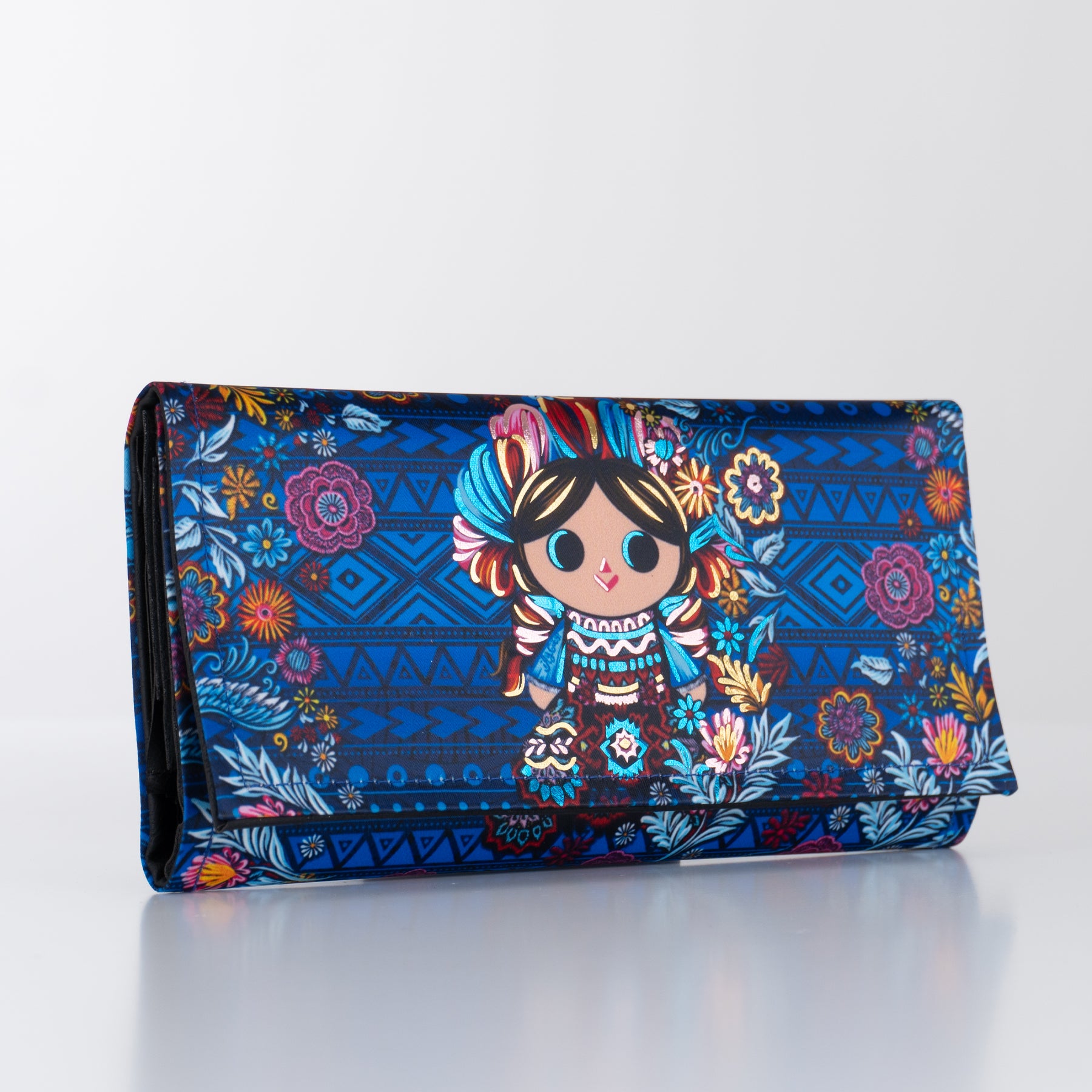 Cartera de dama que tiene como protagonista a Petrita, nuestra reinterpretación de la muñeca mazahua. Cuenta con aplicaciones en vinil metalizado.