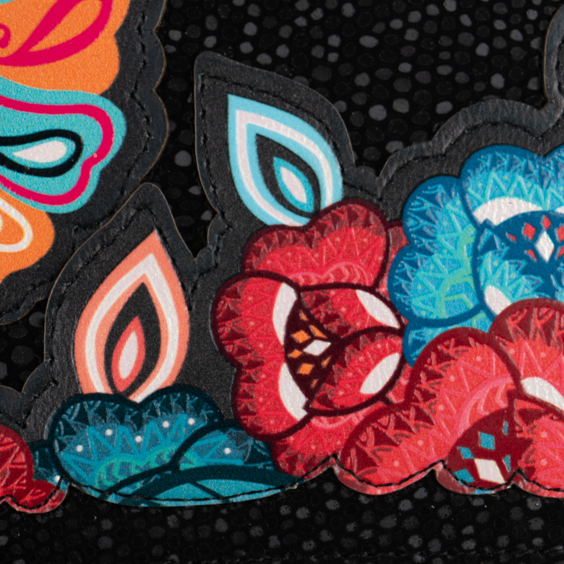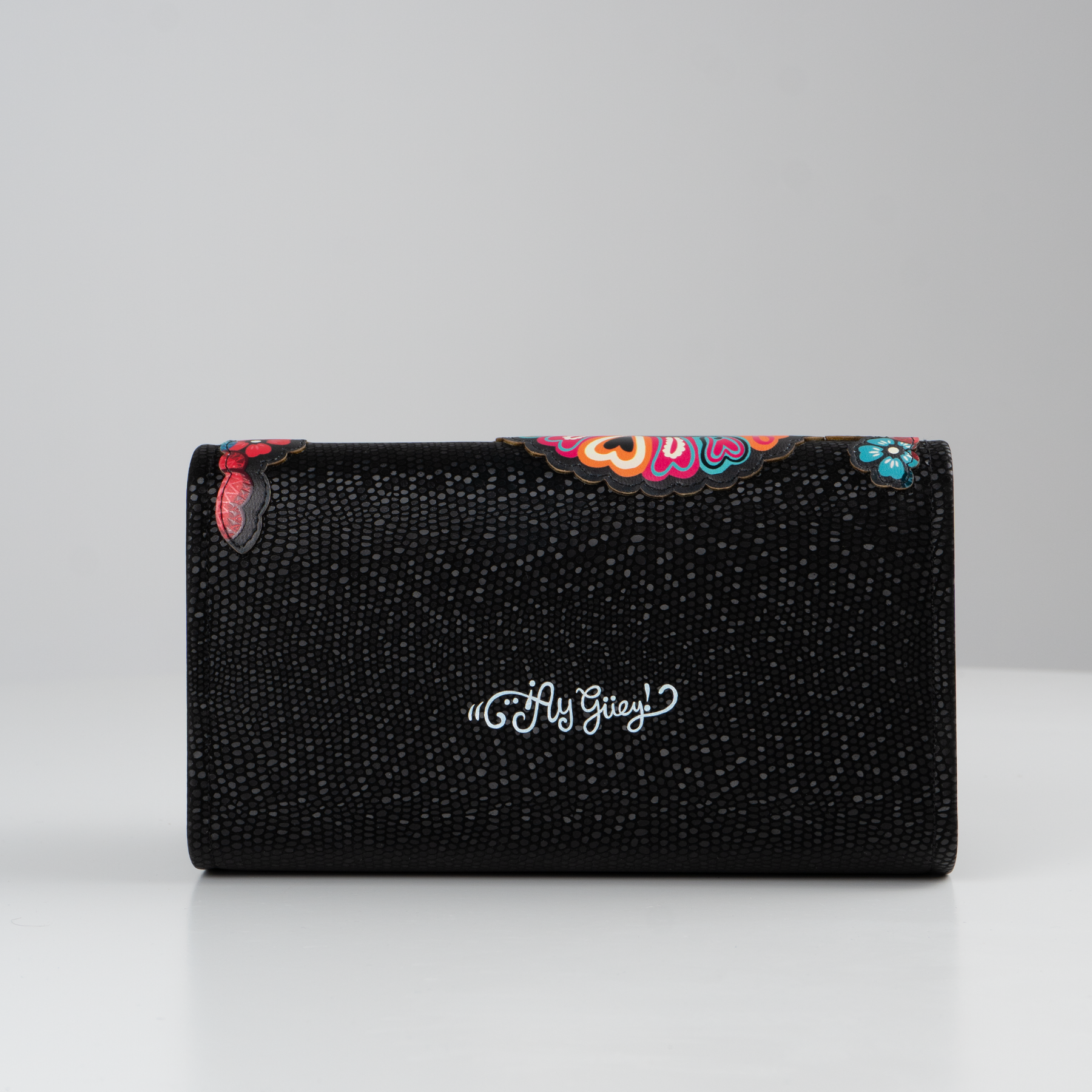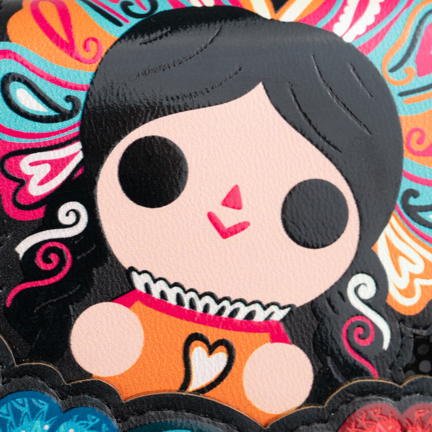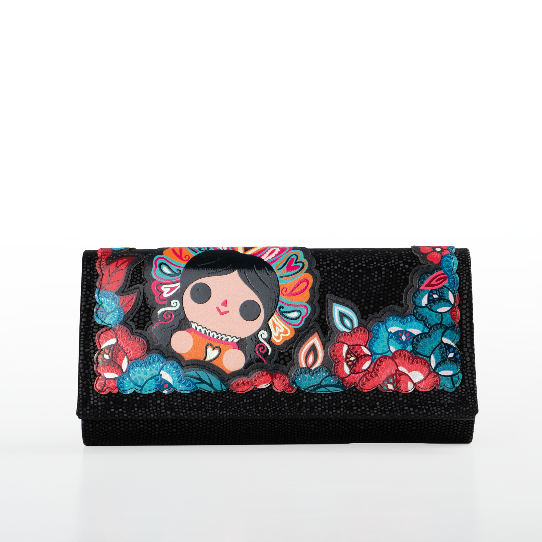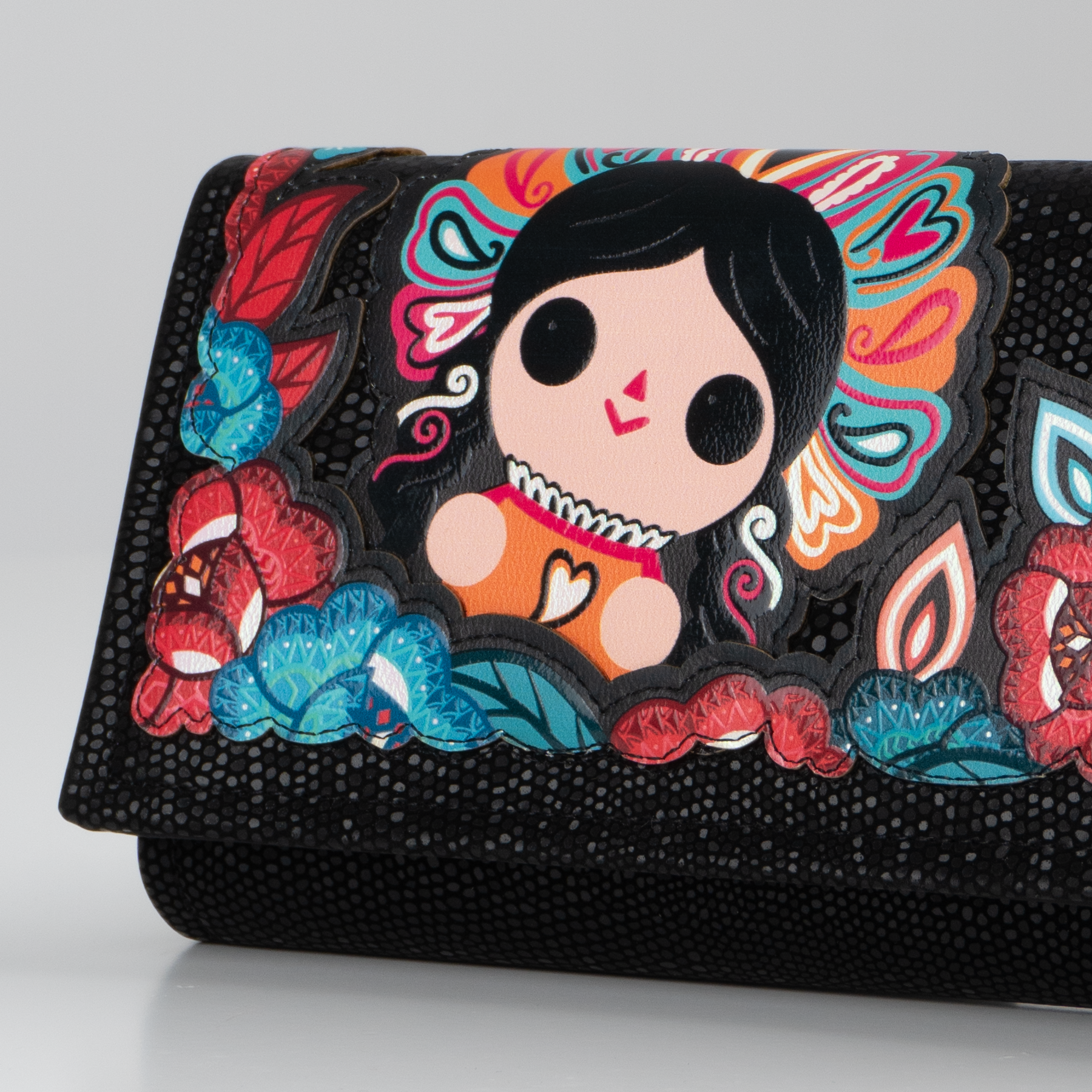 Cartera de dama inspirada en Petrita, nuestra interpretación de la muñeca mazahua y las flores presentes en los bordados oaxaqueños.