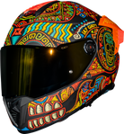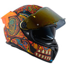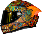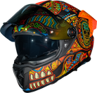 Domina el camino con el imponente Casco Mega-Kala. Su diseño, inspirado en los vibrantes colores de los bordados tradicionales y la festiva temática del Día de Muertos, te asegura ser el centro de todas las miradas. Más allá de su impactante estética de calavera, este casco ofrece la seguridad y comodidad que necesitas para cualquier aventura. Un tributo al arte mexicano que te protege con la tecnología Axxis.
