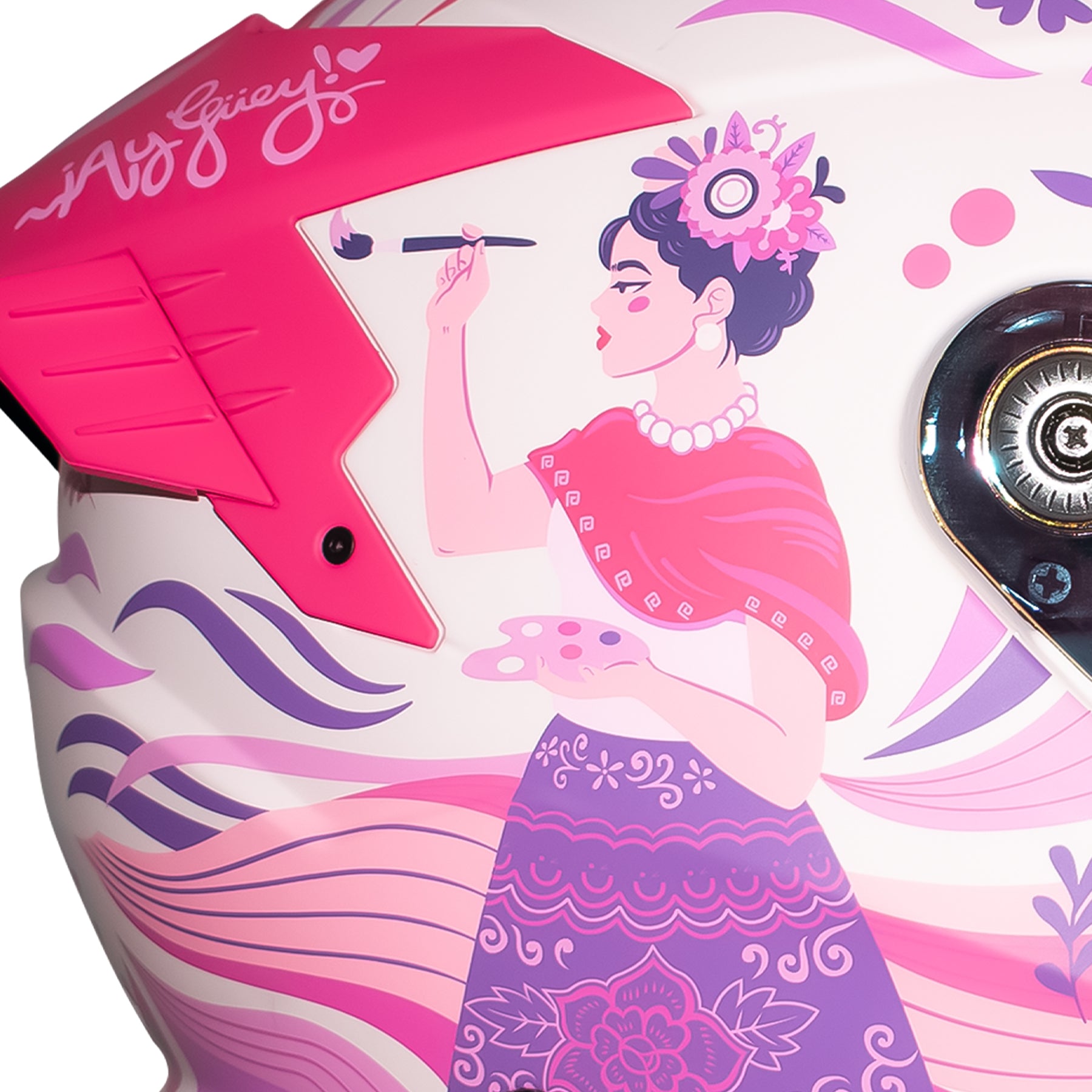 Los gráficos son homenaje a la representación artística de una pintora, capturada en un momento de inspiración y creatividad. Este detalle, que celebra el talento femenino y el arte mexicano, convierte a este casco en una declaración de estilo y un homenaje a la pasión por la pintura y la velocidad.