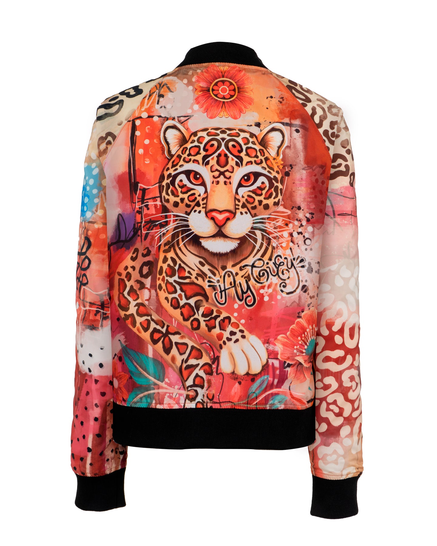 Estampado vibrante de un majestuoso jaguar (Balam) rodeado de motivos florales y botánicos en tonos shocking. Una explosión de glamour tropical y arte audaz.
