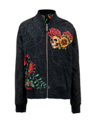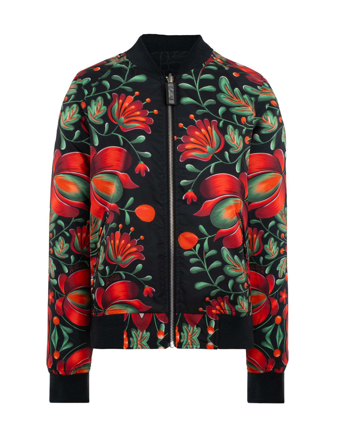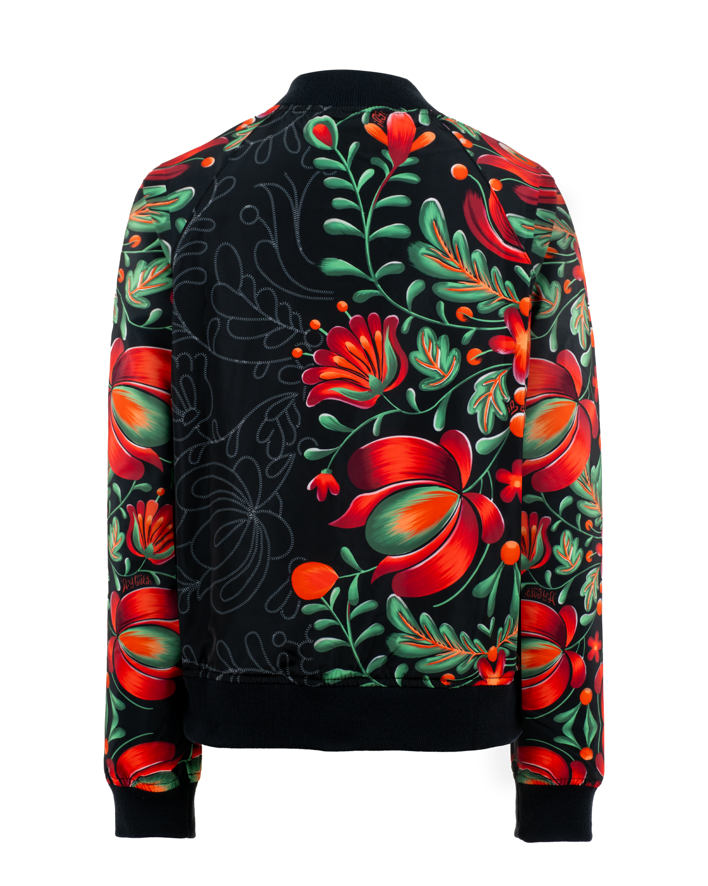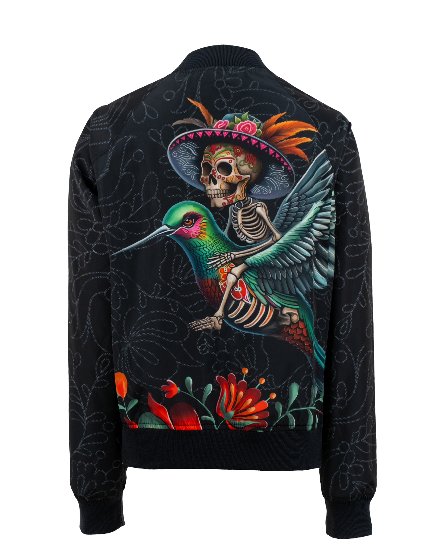 CATRICOL es una pieza de diseño con fuerte inspiración mexicana. Combina un estampado floral vibrante con un fondo negro intenso, destacando por su arte trasero: una Catrina esqueleto montada en un colibrí. Esta chamarra ofrece un estilo urbano, ajuste cómodo y la capacidad de transformar cualquier look. Es una prenda única para expresar personalidad y llevar la riqueza cultural con un toque moderno.