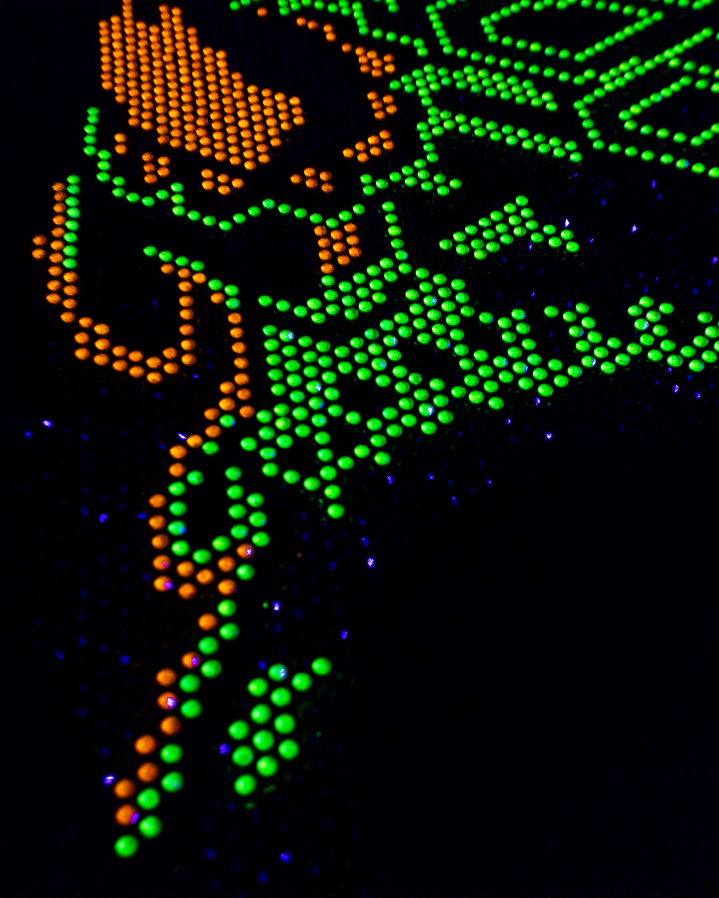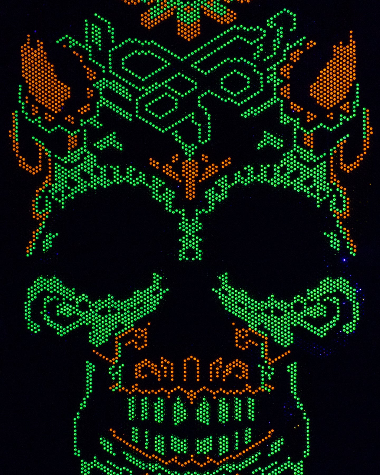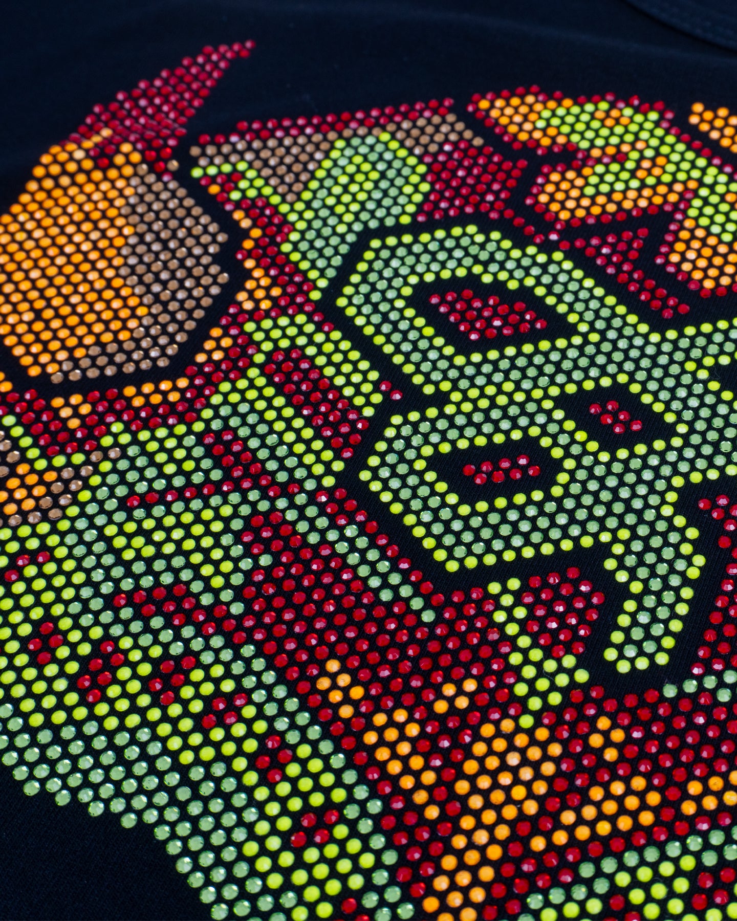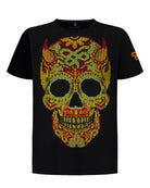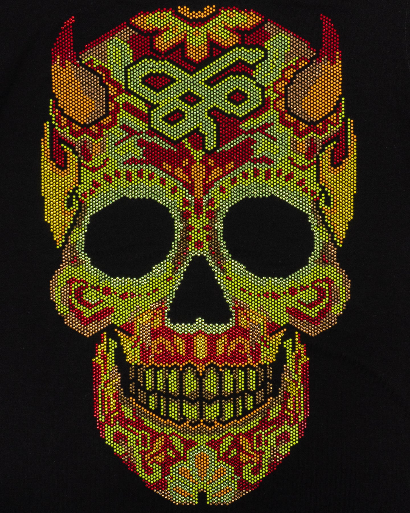 Pieza de alto impacto que fusiona la iconografía tradicional con una estética moderna y audaz. Sobre una base de negro profundo, destaca un gráfico de calavera con cuernos, diseñado íntegramente con pedrería.