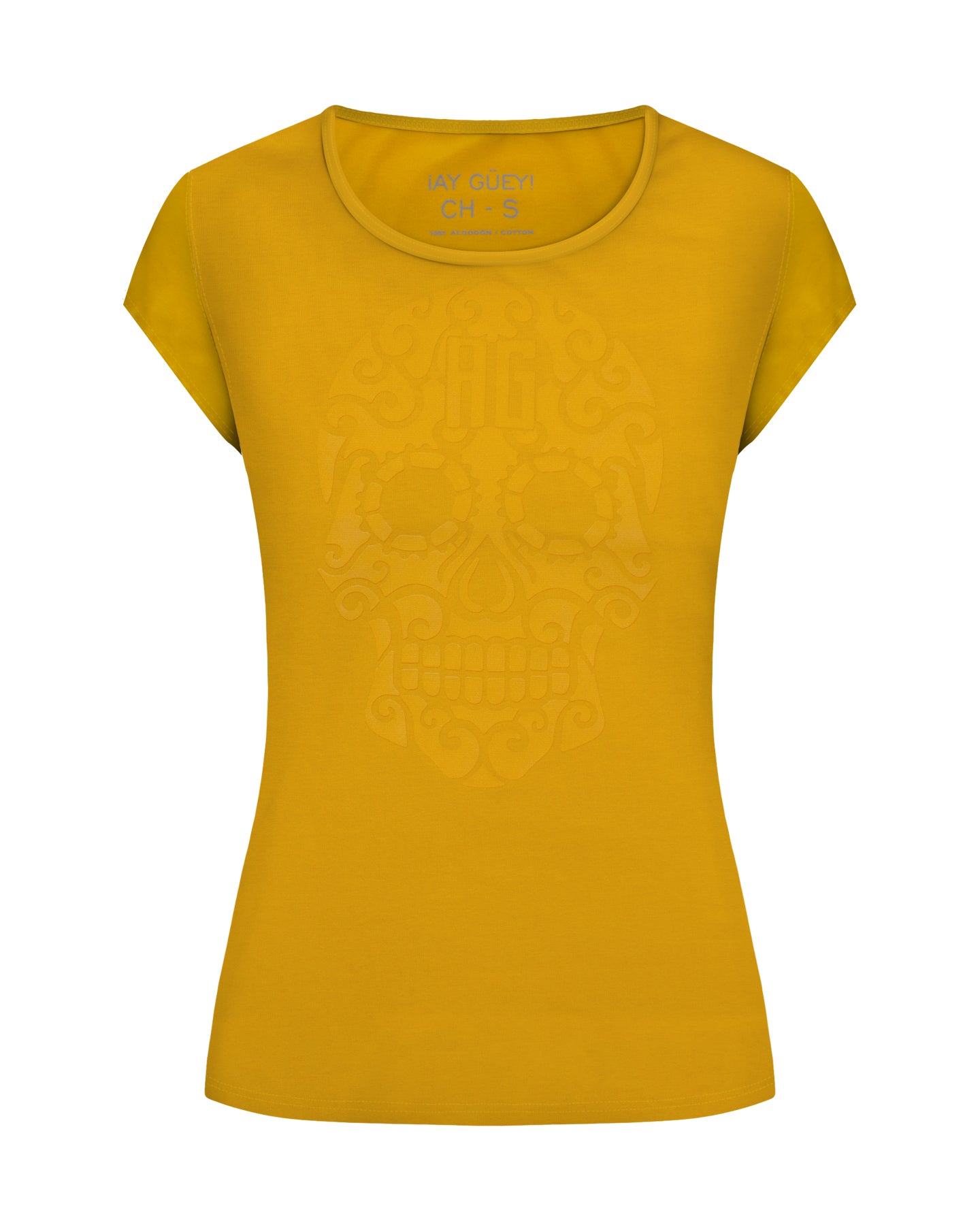 Esta playera de corte femenino combina la tendencia minimalista con un profundo guiño a la cultura mexicana. El diseño de calavera en relieve tono sobre tono (mismo color) es un detalle sofisticado para quienes prefieren llevar sus símbolos con sutileza.