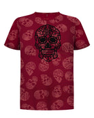 Esta playera roja presenta un patrón integral de cráneos en contraste, destacando un calavera central en color negro con calados detallados. Su diseño de corte estándar combina iconografía tradicional con un estilo urbano audaz, ideal para un look casual con personalidad.