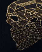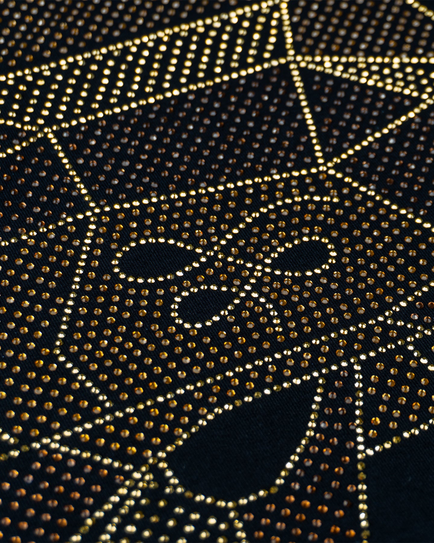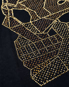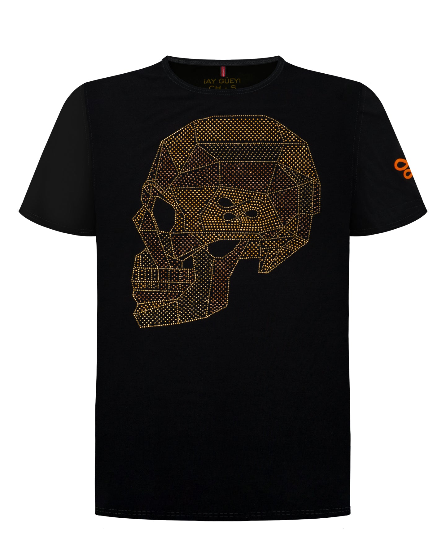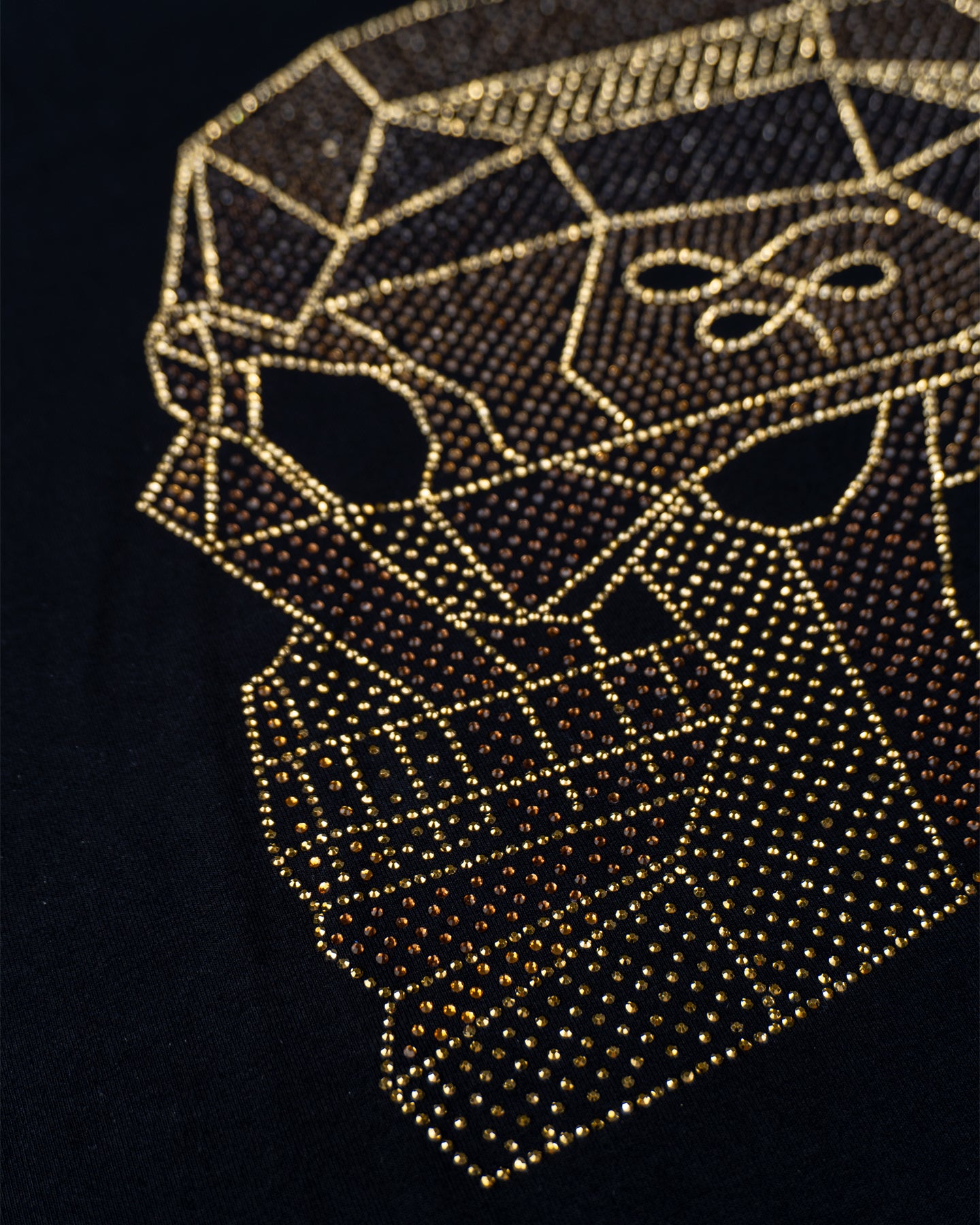 La playera Felguerez Oro transforma la clásica calavera en una pieza de arte geométrico. Este diseño se elabora completamente con una aplicación de pedrería dorada y ámbar que cubre la calavera facetada, creando un efecto de mosaico brillante y reflectante. La pedrería le confiere un acabado lujoso y llamativo, ideal para destacar con un toque de glamour y sofisticación.