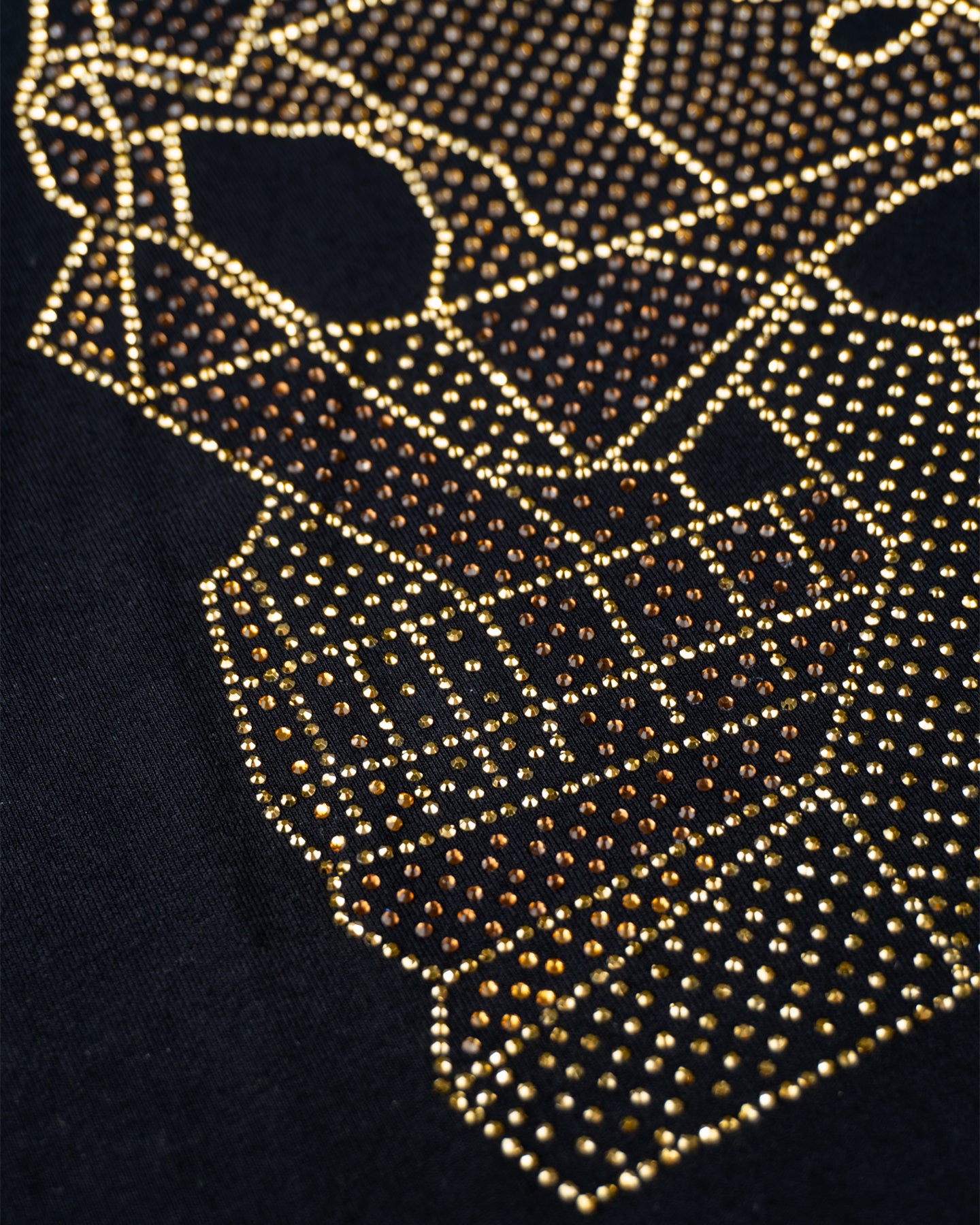 Playera estampada con aplicaciones de pedrería dorada - Modelo FELGUEREZ