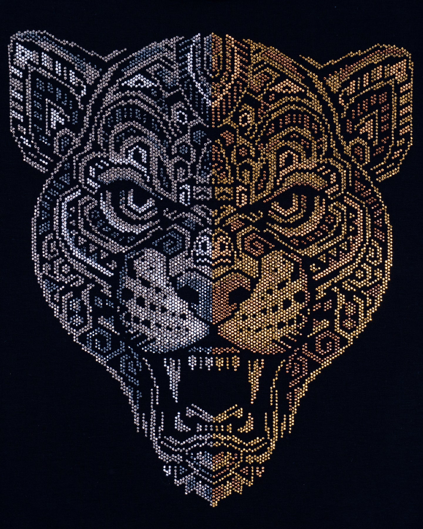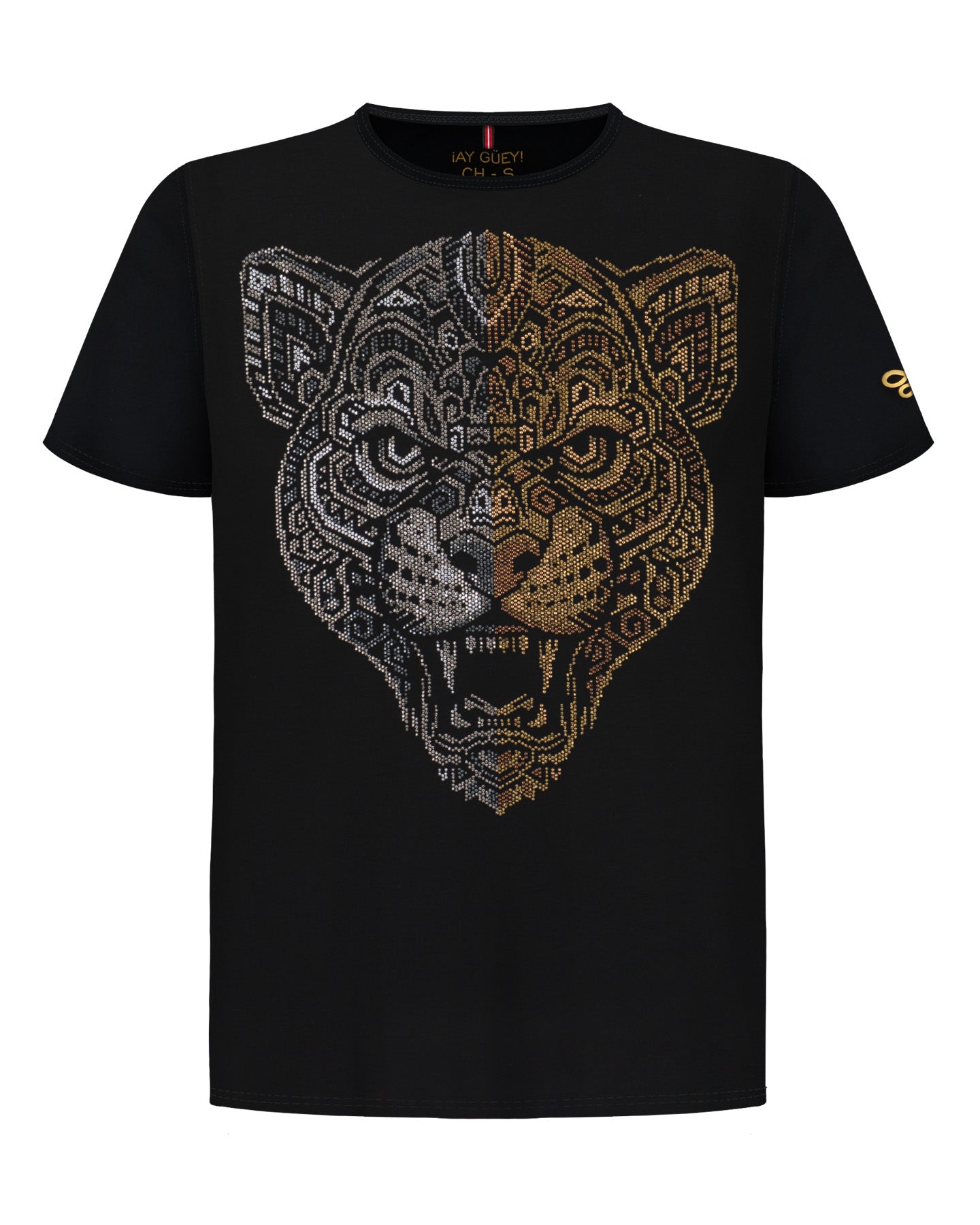 La playera GEMINI captura la esencia dual de la fuerza y la sofisticación a través de un diseño de jaguar elaborado meticulosamente con miles de cristales de pedrería. Es la elección perfecta para quienes buscan destacar con un lujo sutil y un estilo audaz.