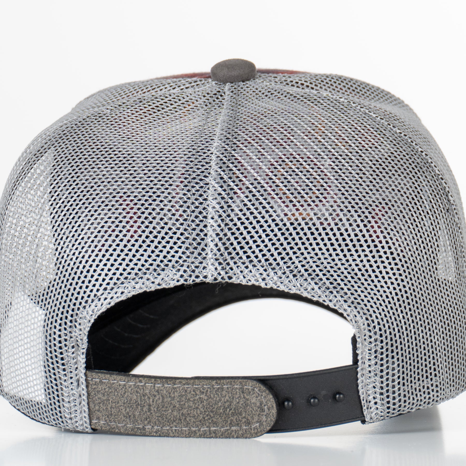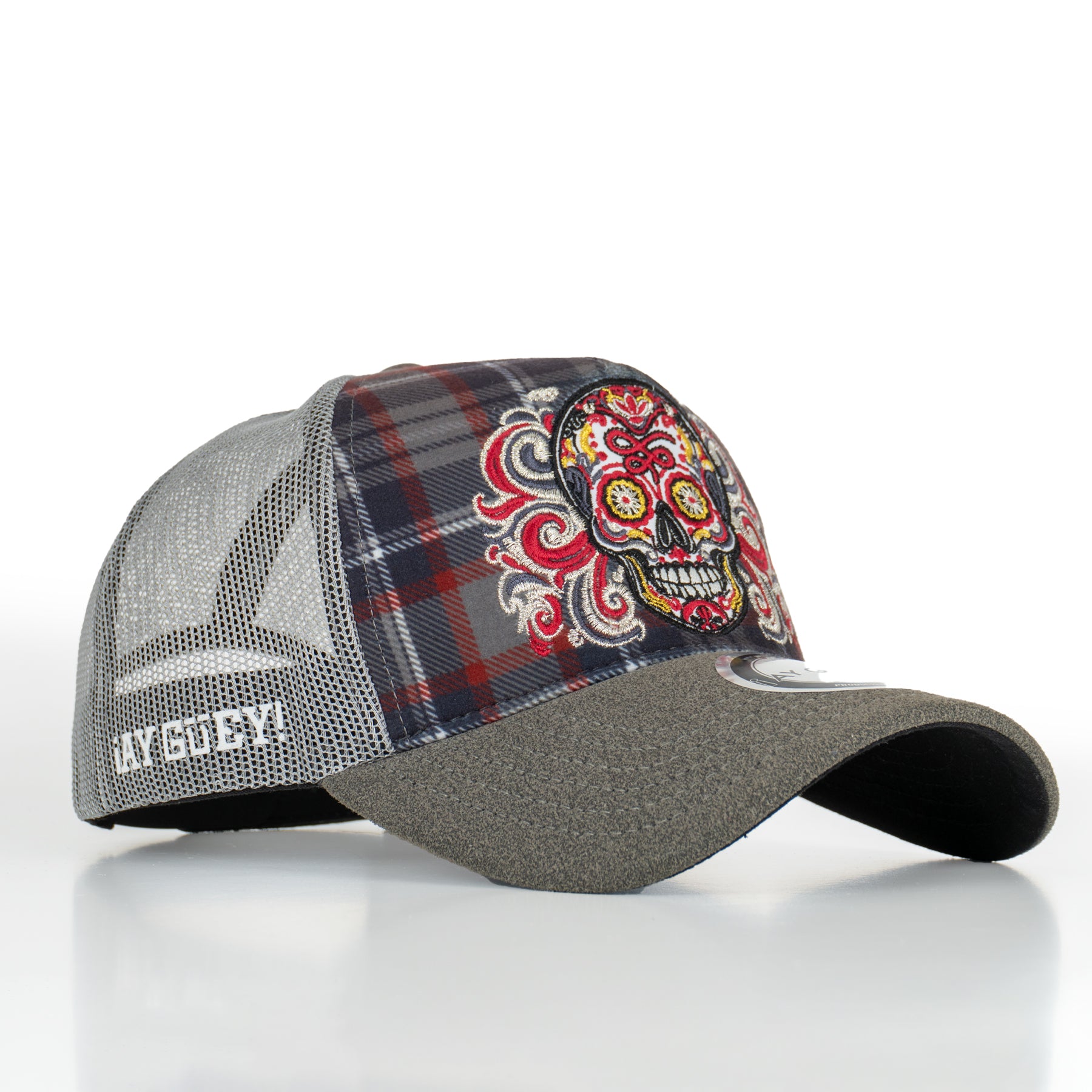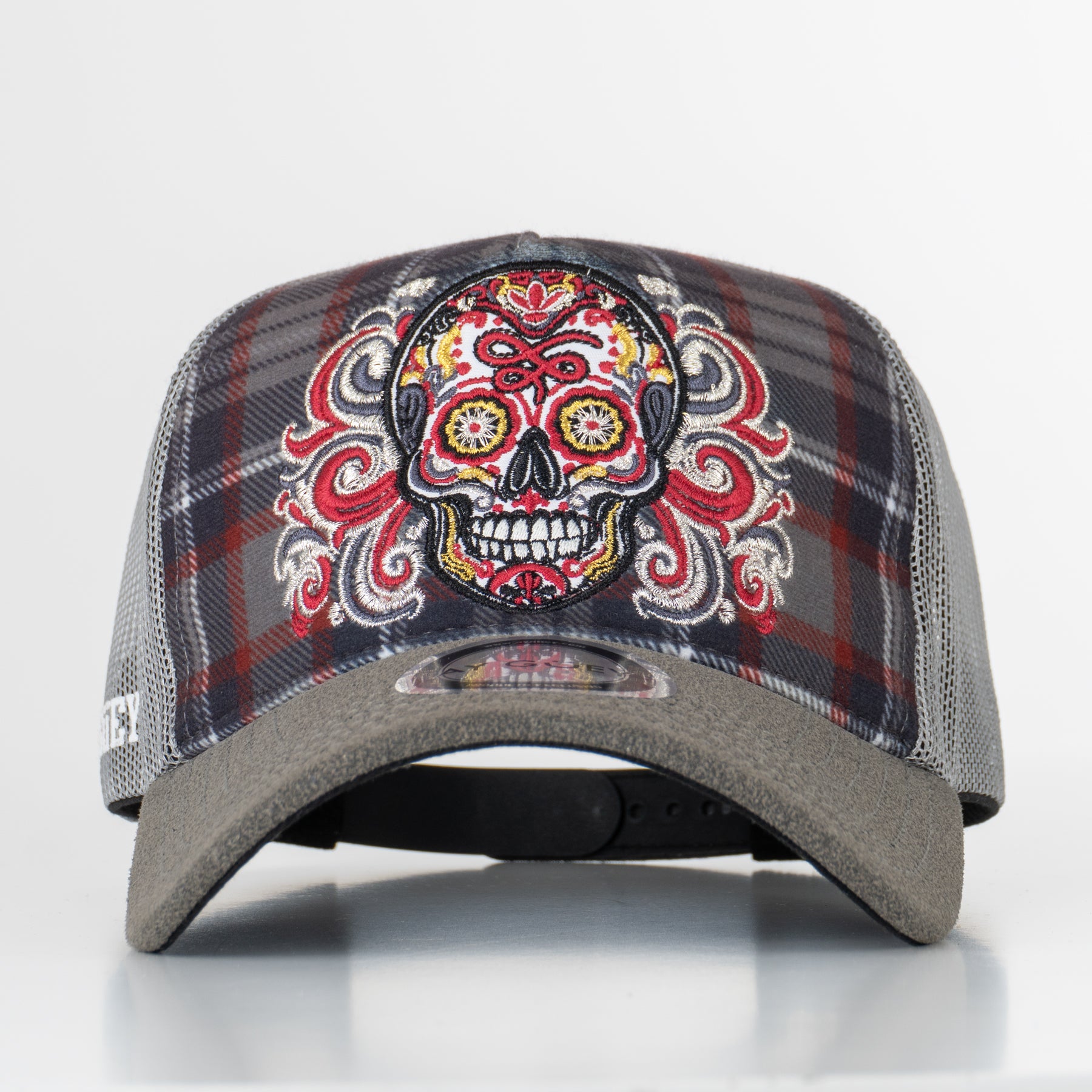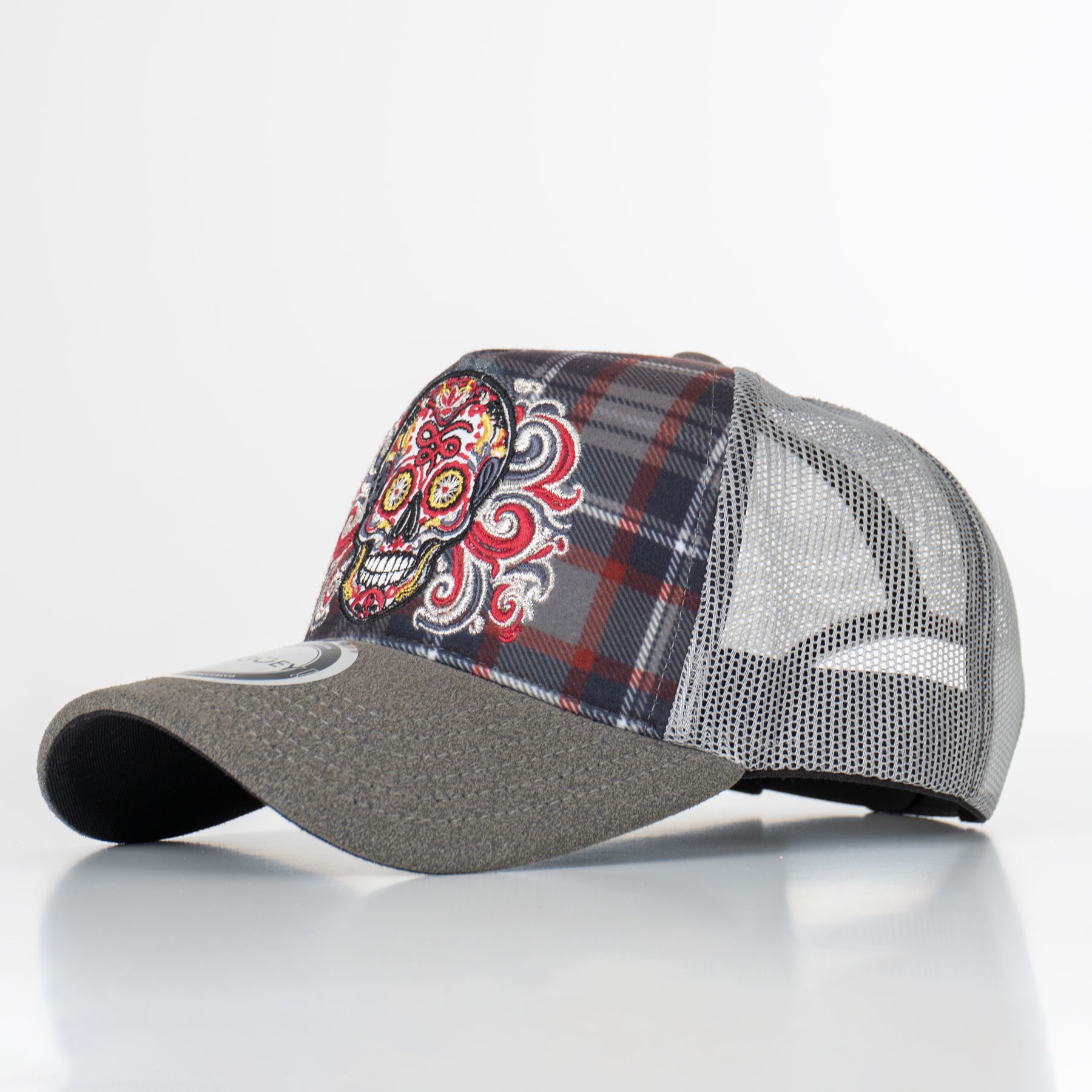 La gorra Porfirio redefine el estilo trucker con una fusión atrevida. Su corona frontal luce un patrón tartán en tonos oscuros, sirviendo de lienzo para un detallado bordado de una Calavera de Azúcar con remolinos rojos y dorados que capturan la esencia del arte folclórico.