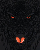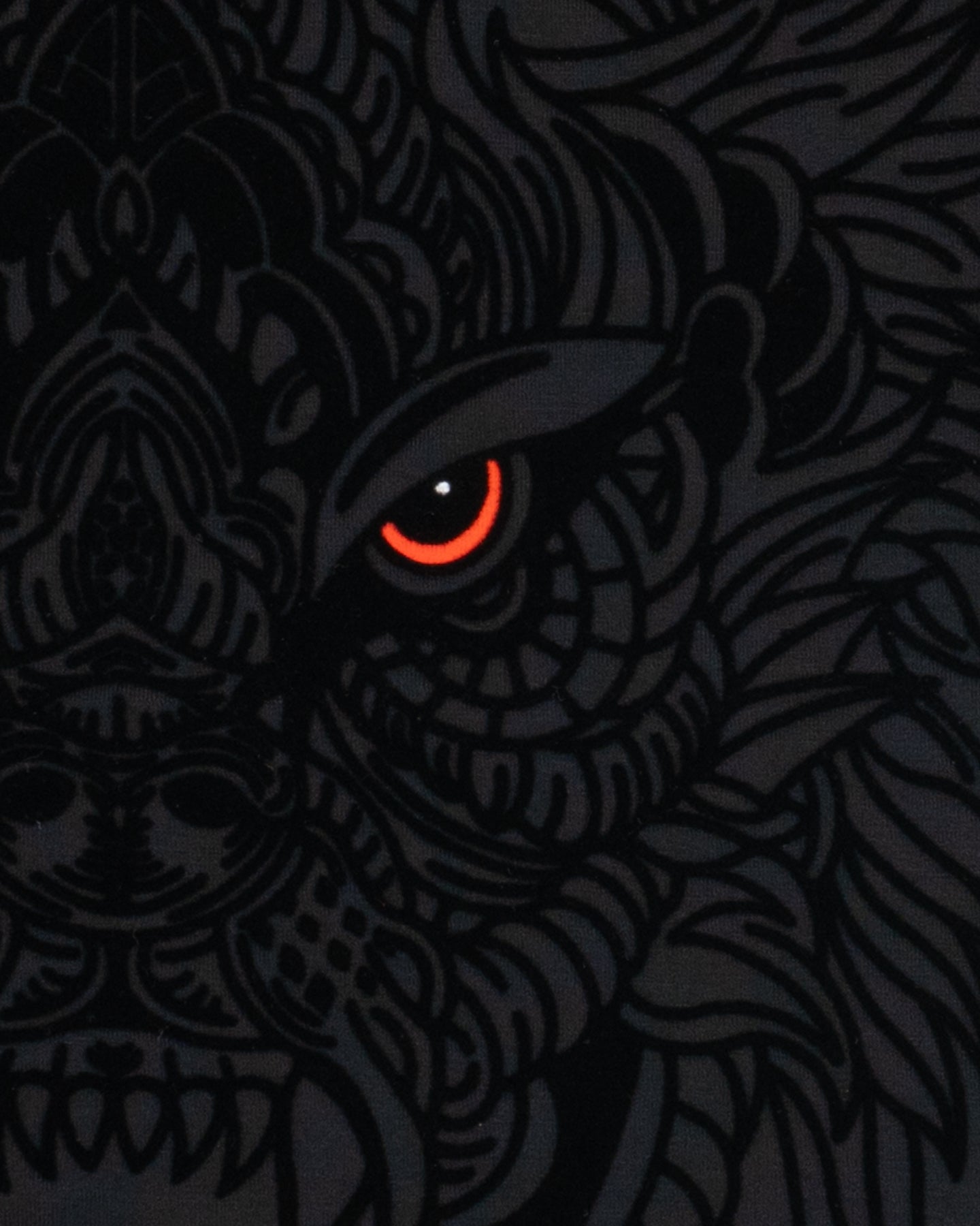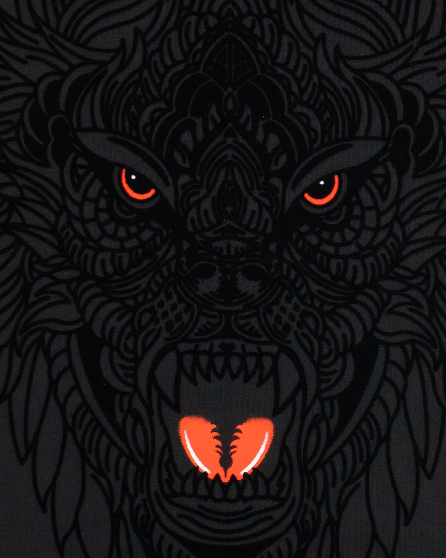 Pieza que captura la fuerza y el misticismo precolombino. Sobre un fondo negro, el imponente rostro del lobo destaca gracias a la técnica de flock, ofreciendo una textura suave y aterciopelada al diseño. La serigrafía resalta los detalles clave: sus ojos y lengua en un rojo intenso, creando un contraste dramático. Es una prenda cómoda y de alta calidad, perfecta para un look audaz que combina diseño tribal y estilo contemporáneo.