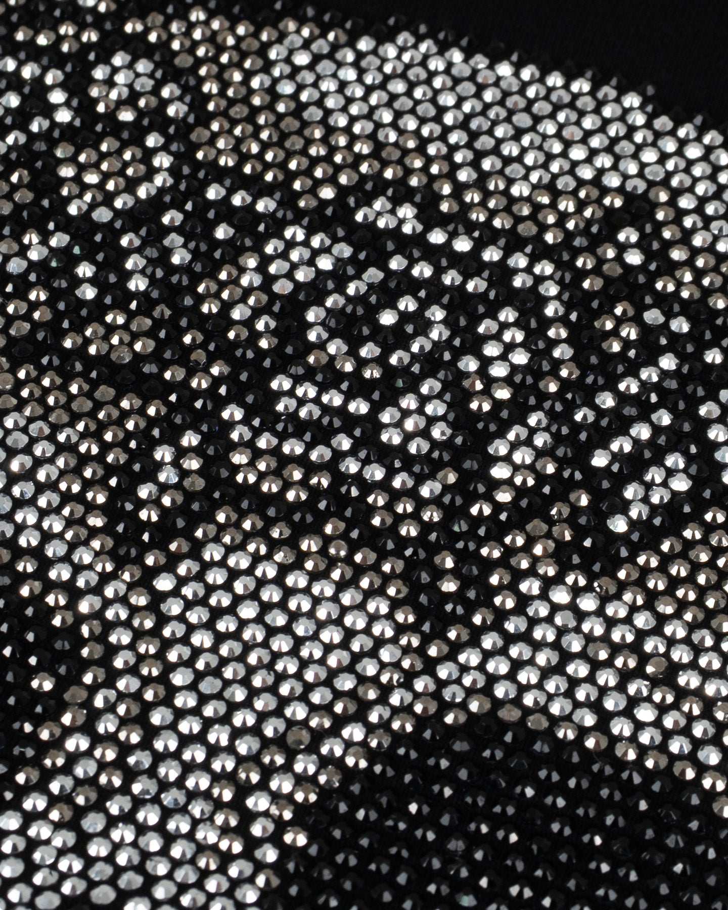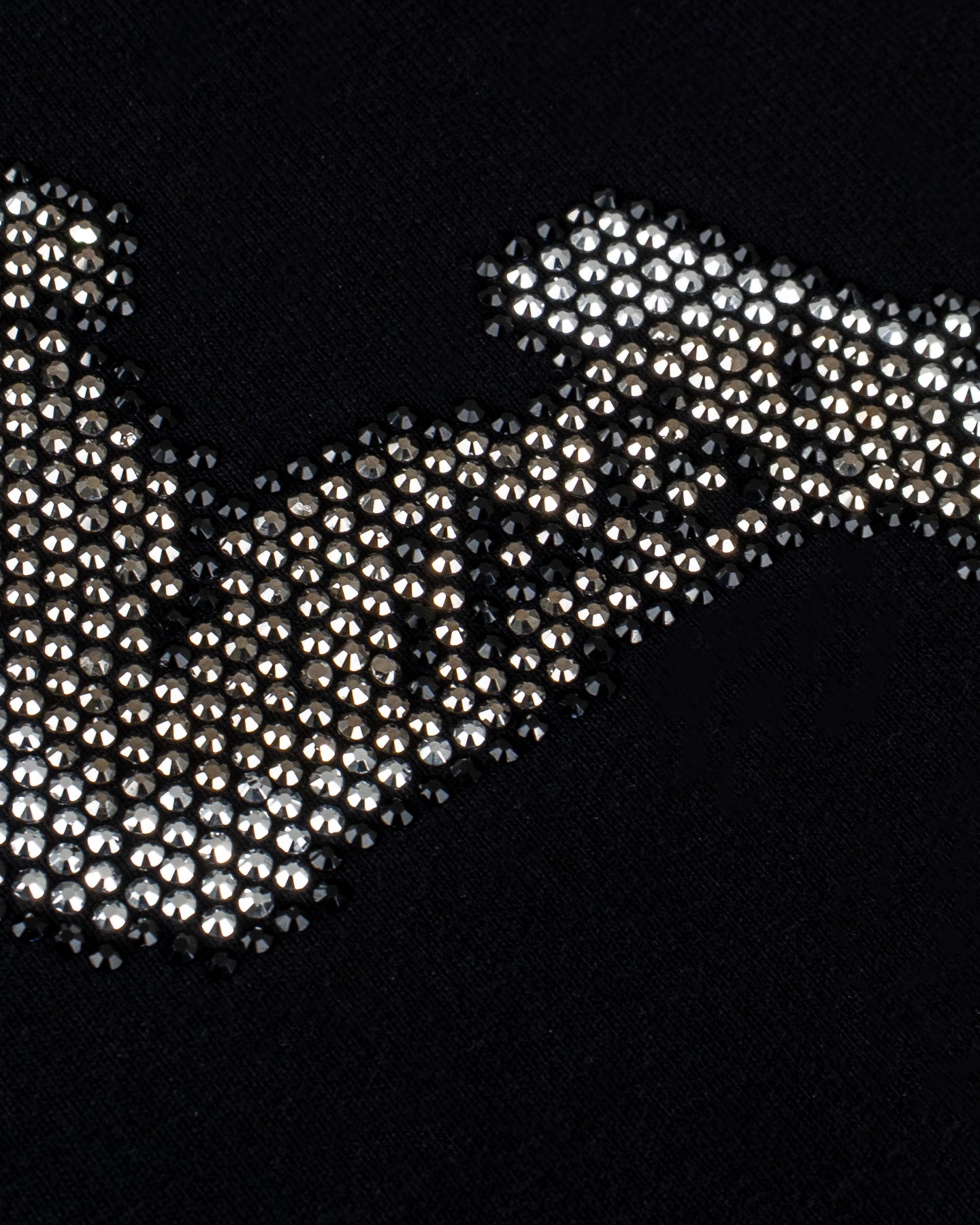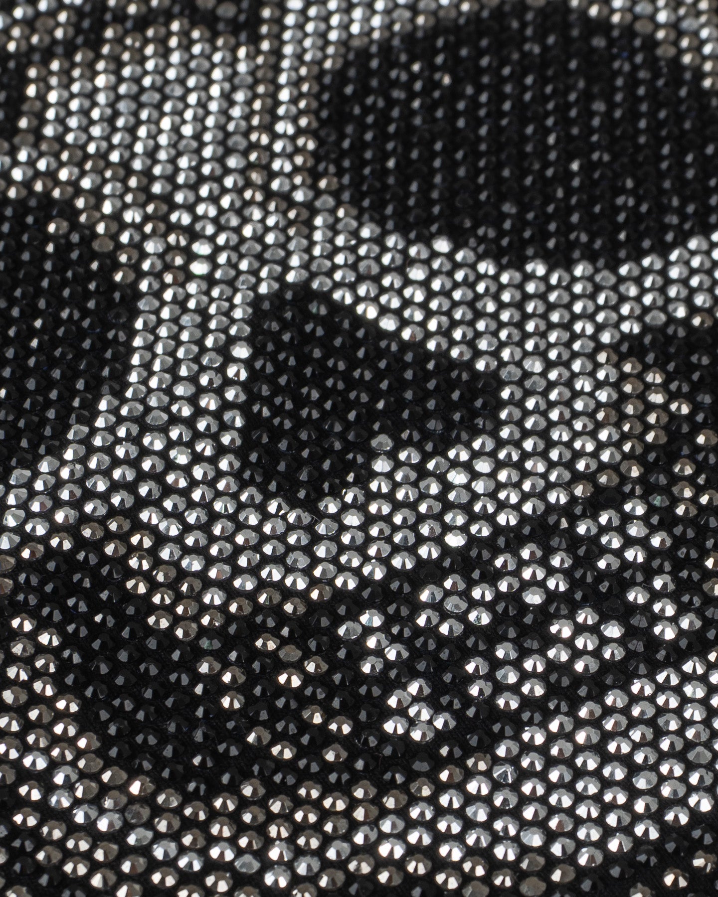 La playera MIGUELITO es la pieza clave para un estilo que desafía lo convencional. Sobre un fit clásico en color negro, se presenta un impactante diseño central: una calavera (inspirado en un cupido), coronado con flores y con arco y flecha. Este arte está cubierto completamente con pedrería plateada, un acabado que no solo le da un brillo espectacular, sino una textura de lujo y una presencia visual inigualable