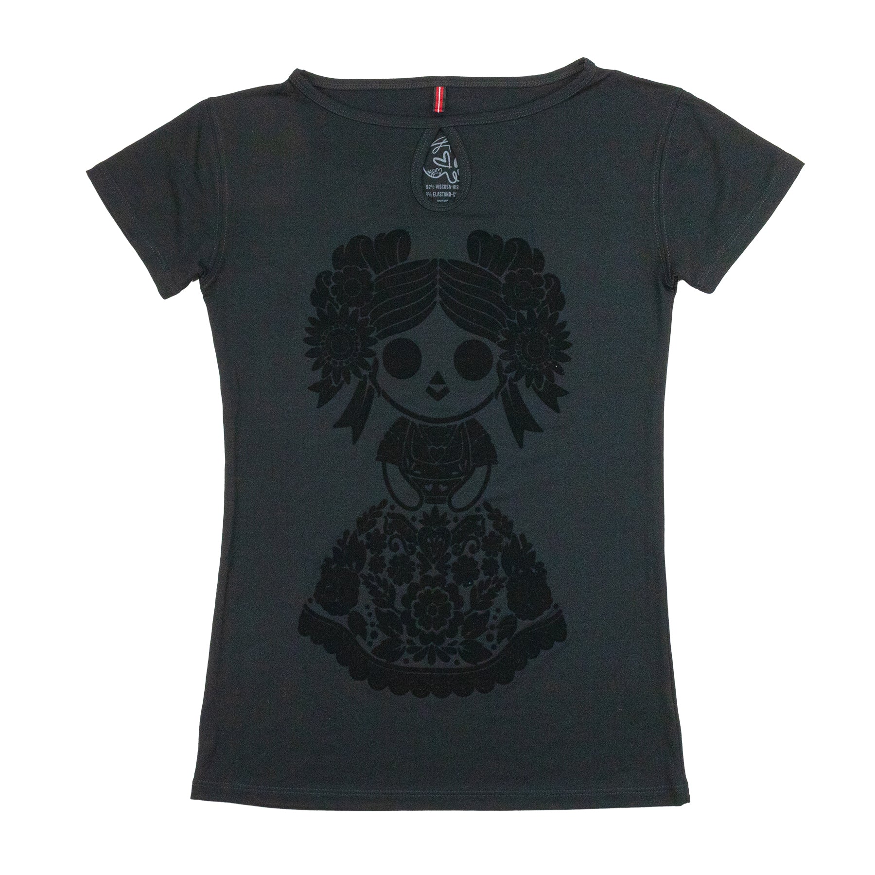 Diseño inspirado en las muñecas mazahuas, en los patrones del textil mexicano aplicado en las flores del vestido.