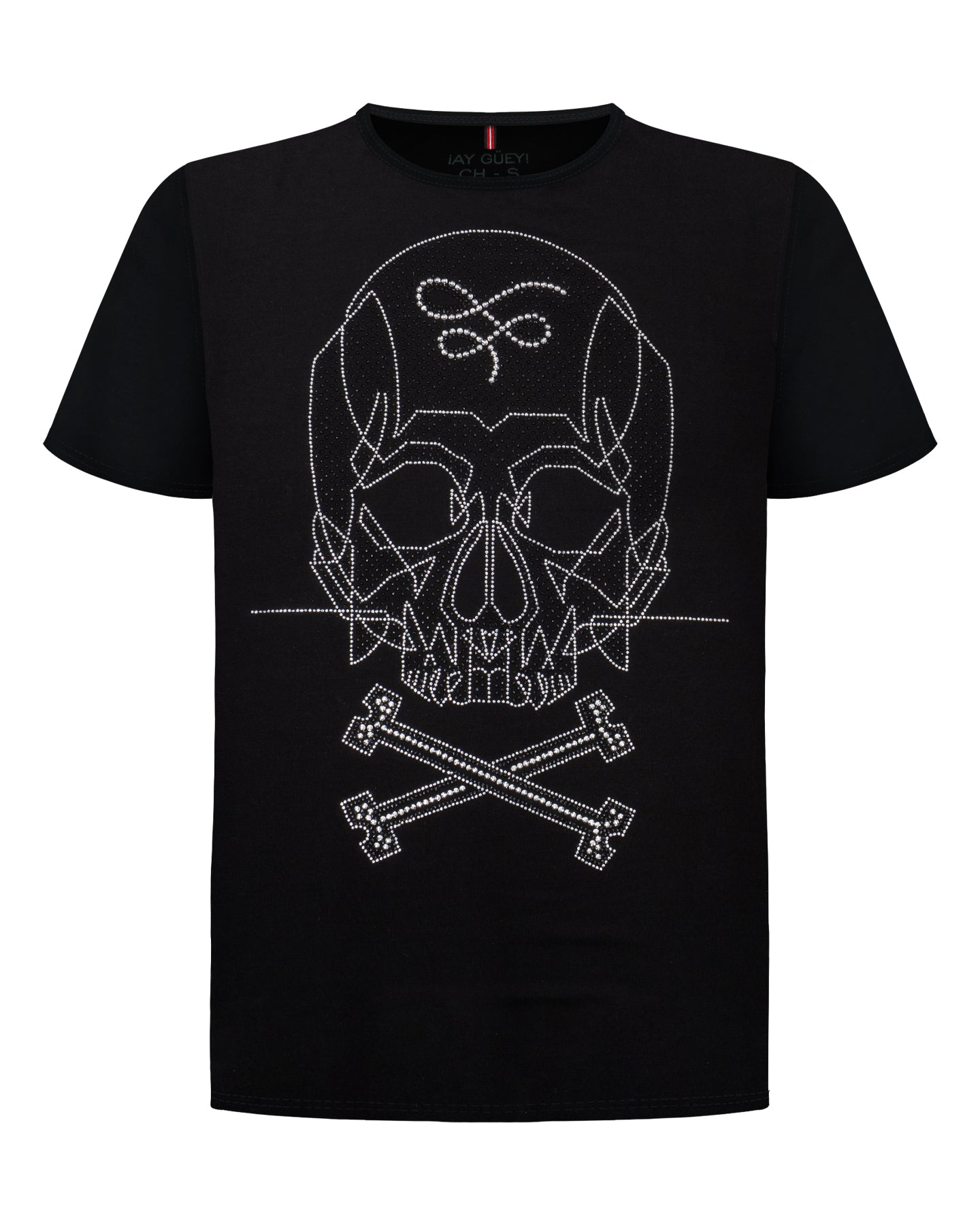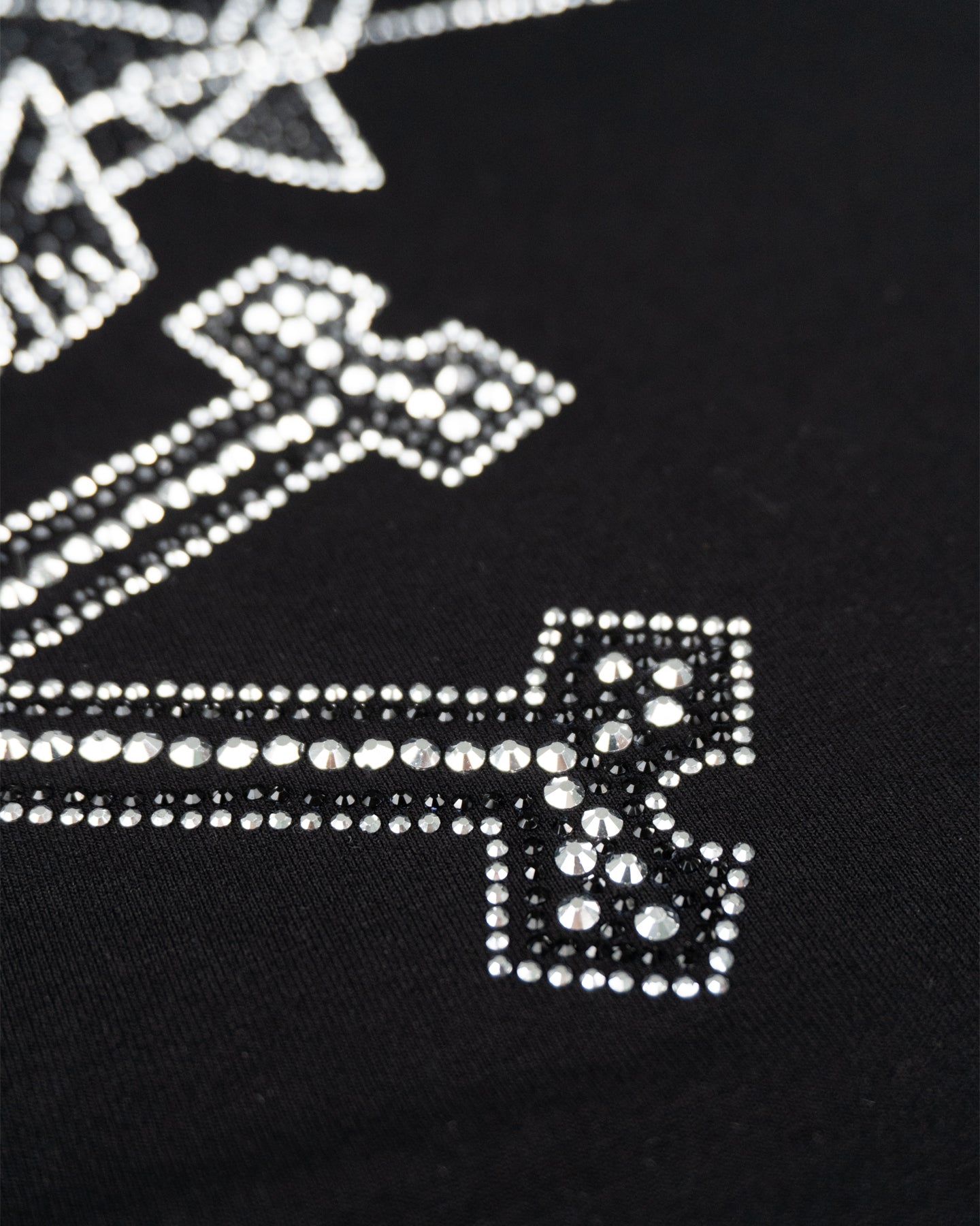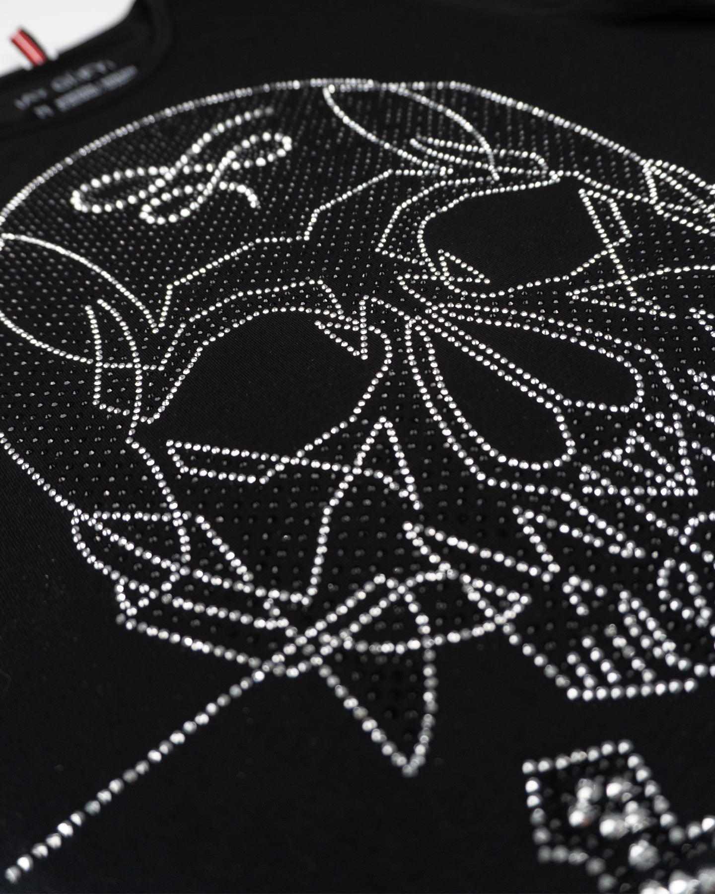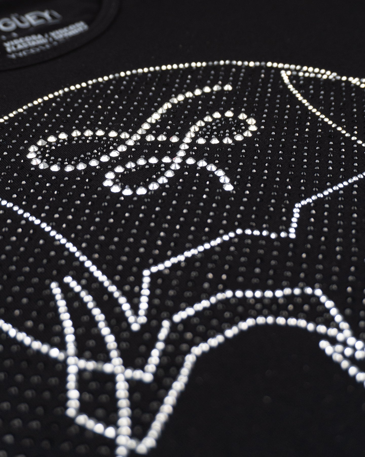 La playera Pinches no es para los que se asustan fácil. Aquí, la calavera se rebela, plasmada en una aplicación de pedrería plateada que dibuja contornos nítidos y líneas desafiantes. Con un toque de osadía, esta pieza se adueña de la irreverencia, culminando en los icónicos huesos cruzados que sellan su declaración de principios.
