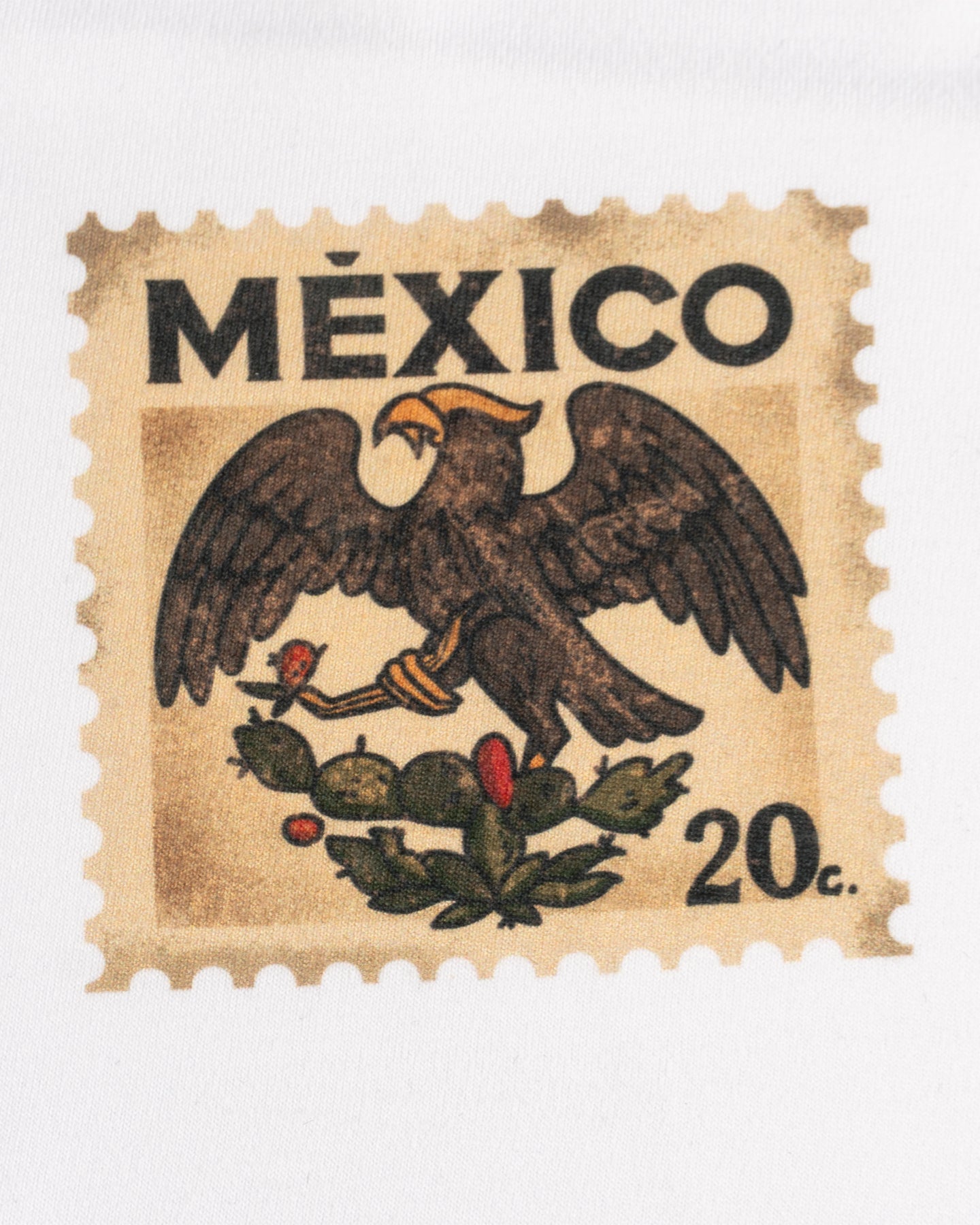 La playera MIS TIMBRES es una declaración de estilo minimalista que rinde homenaje a la identidad mexicana. Sobre una camiseta blanca de corte clásico, destaca un estampado tipo sello postal vintage ubicado en el pecho. El diseño imita la apariencia desgastada de un timbre antiguo, con la leyenda "México" y el clásico escudo del águila sobre el nopal, creando un efecto gráfico nostálgico y elegante. Esta es la pieza perfecta para llevar el orgullo patrio con discreción y un aire retro sofisticado.