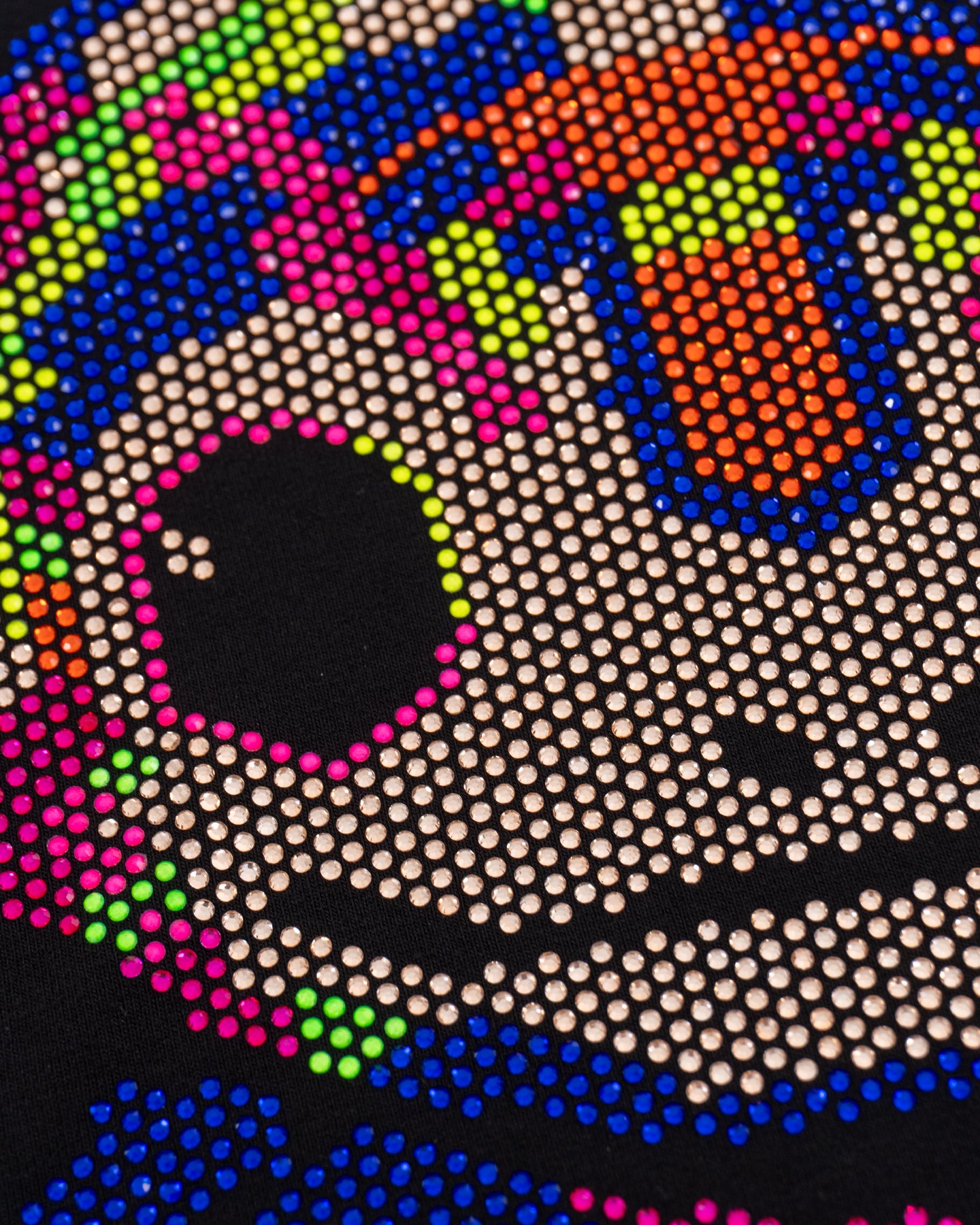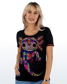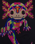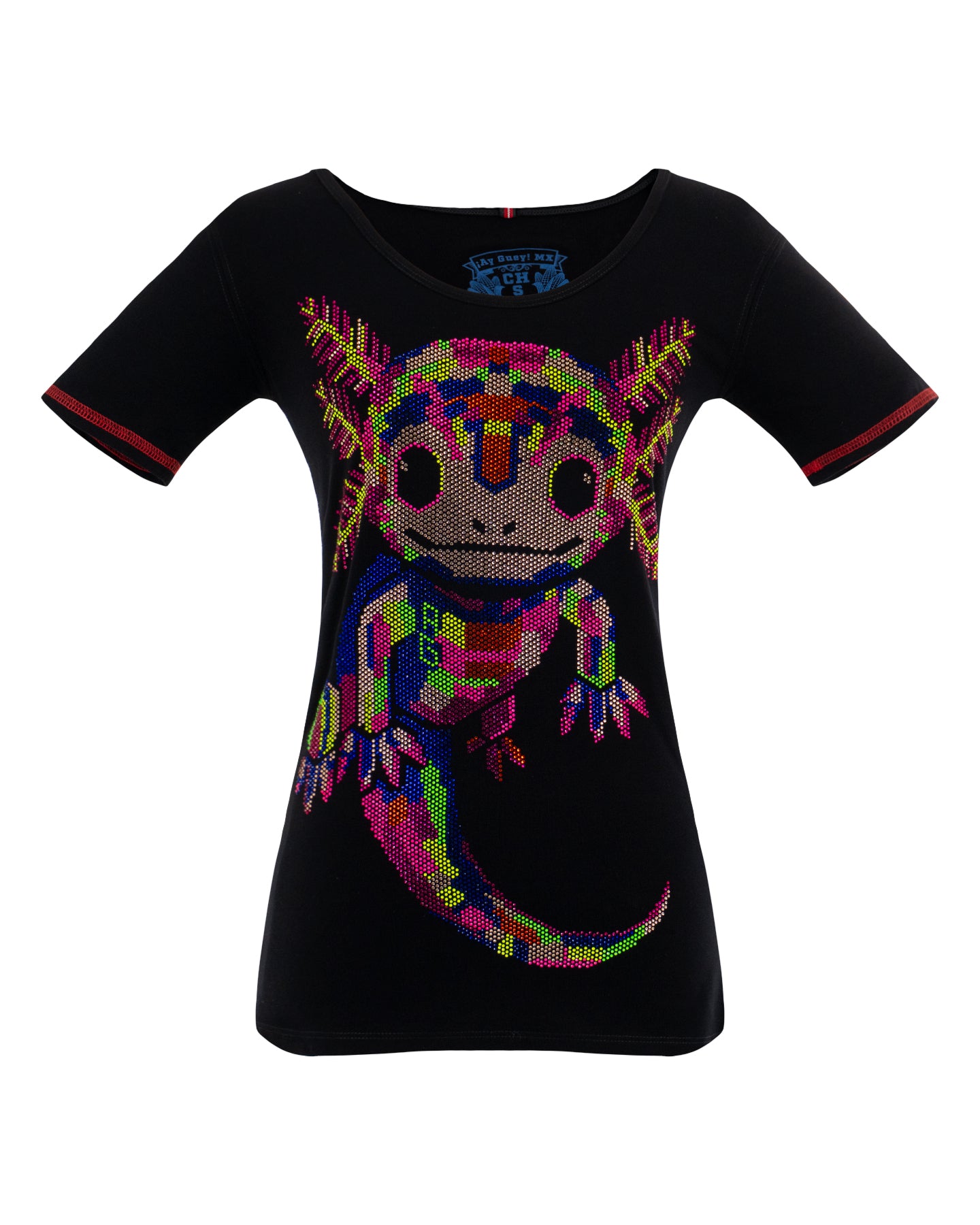 Esta camiseta celebra al ajolote, símbolo de la resiliencia y la magia de México, a través de una reinterpretación artesanal en técnica de pedrería. Cada punto de color evoca a la alegría, fusionando lo ancestral con lo contemporáneo.