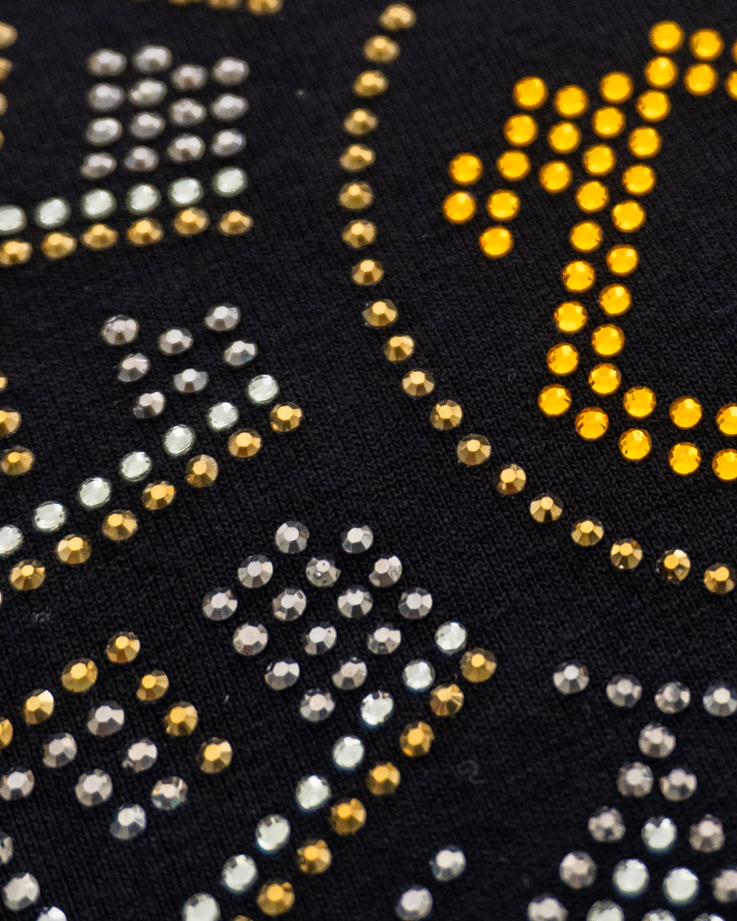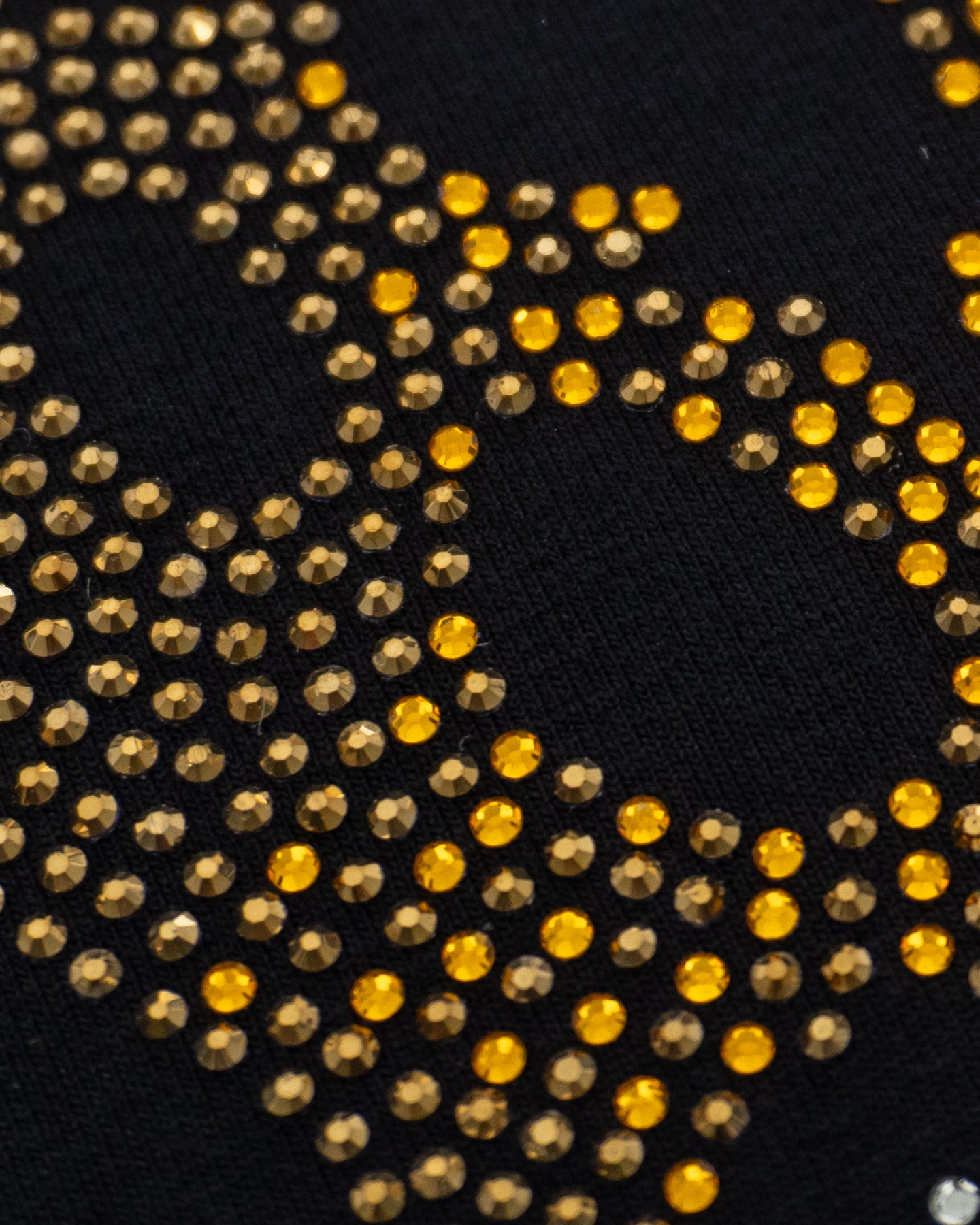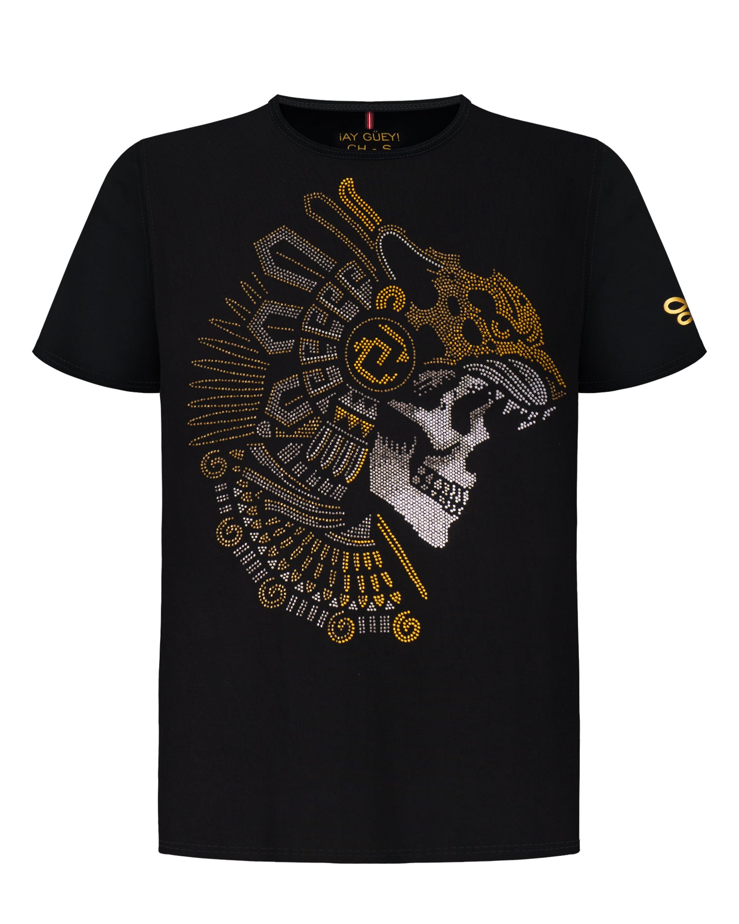 La playera TREPADOR es una pieza que rinde homenaje a la iconografía prehispánica con un toque de lujo contemporáneo. Sobre una playera negra de corte clásico, destaca un imponente diseño lateral de calavera ataviada con un yelmo ceremonial de estilo animalístico. El gráfico está completamente elaborado con una aplicación de pedrería que crean un brillo deslumbrante.